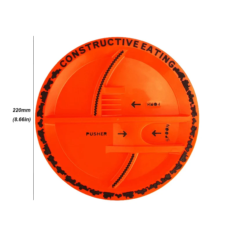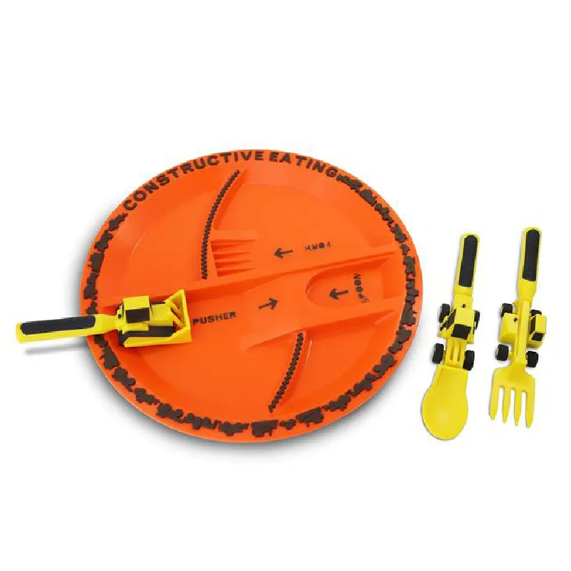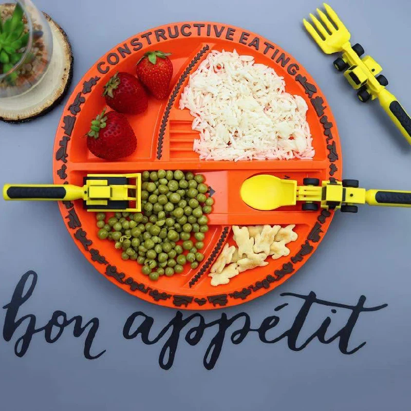 Le design ludique présente des ustensiles inspirés des véhicules de construction, avec une fourchette comme excavatrice, une cuillère comme chargeuse et un couteau comme bulldozer, tous parfaitement dimensionnés pour les petites mains. Cette assiette ronde est astucieusement conçue pour imiter un chantier de construction avec des routes, invitant au jeu imaginatif et à l’interaction à chaque bouchée.