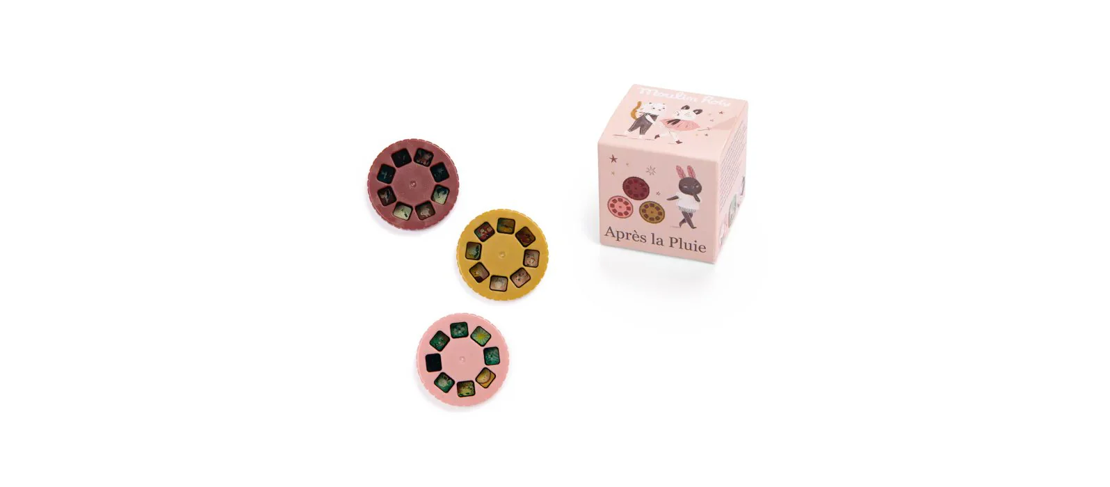 Recharge de trois disques à histoires de la collection Après la Pluie compatibles avec toutes les lampes à histoires Moulin Roty. Pratique, les adeptes des lampes à histoires pourront collectionner facilement les disques.