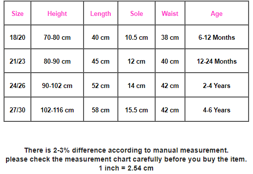 | Taille | Hauteur | Longueur | Semelle | Taille (ceinture) | Âge |