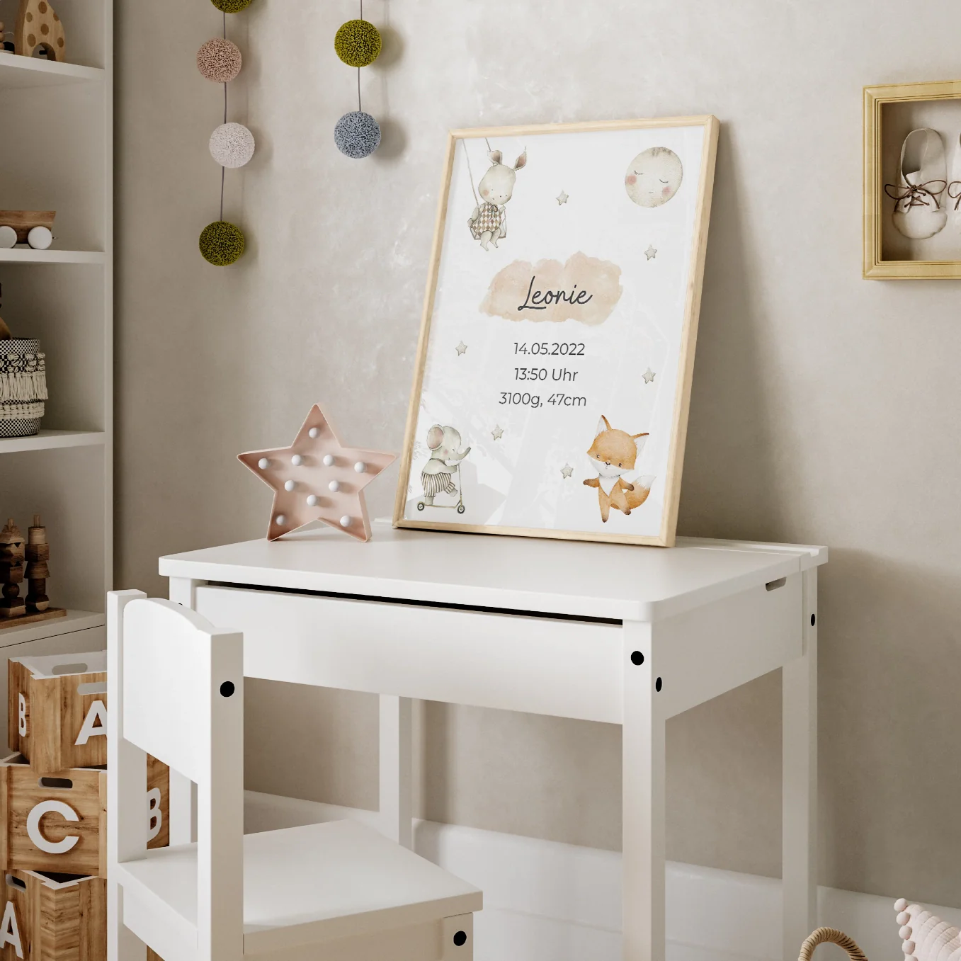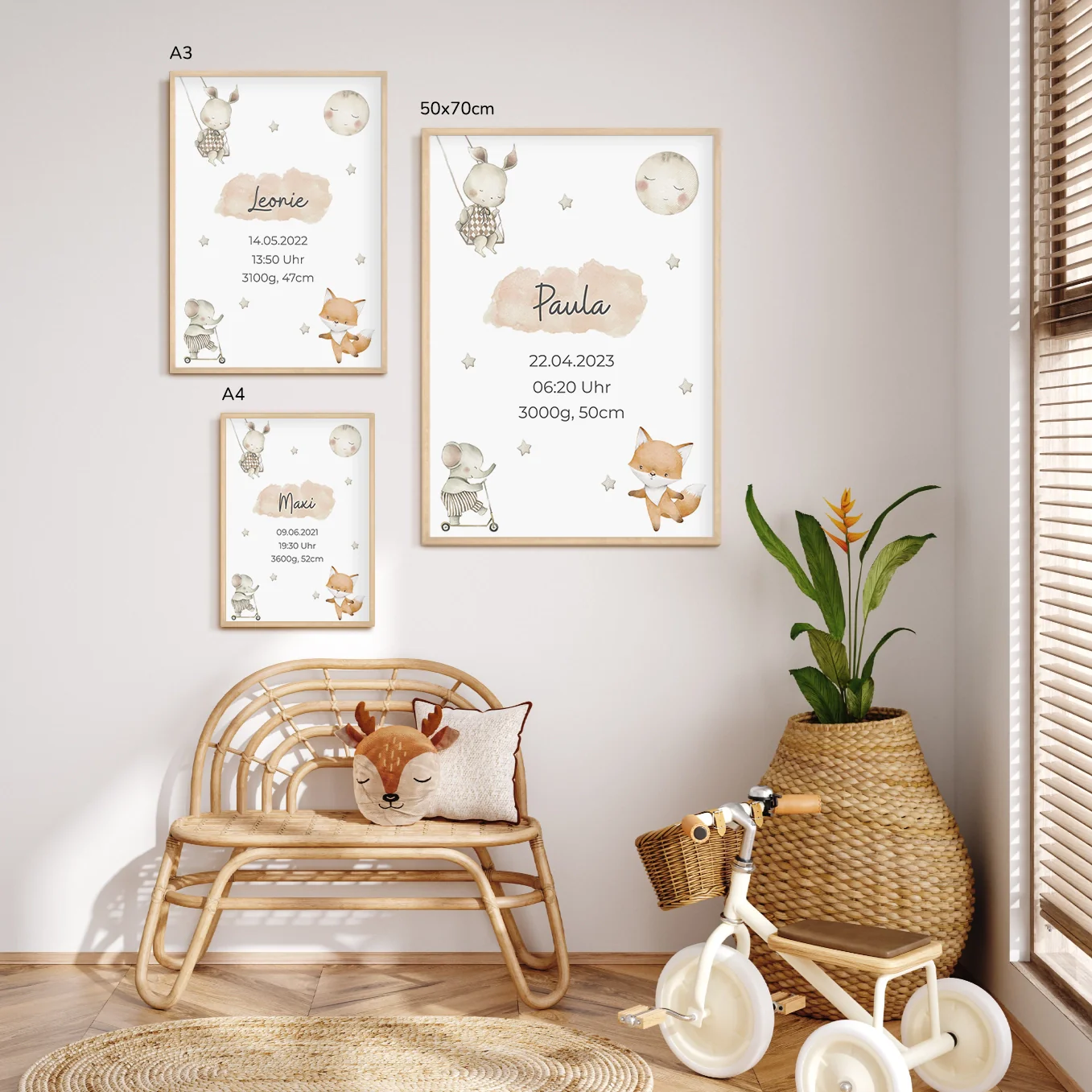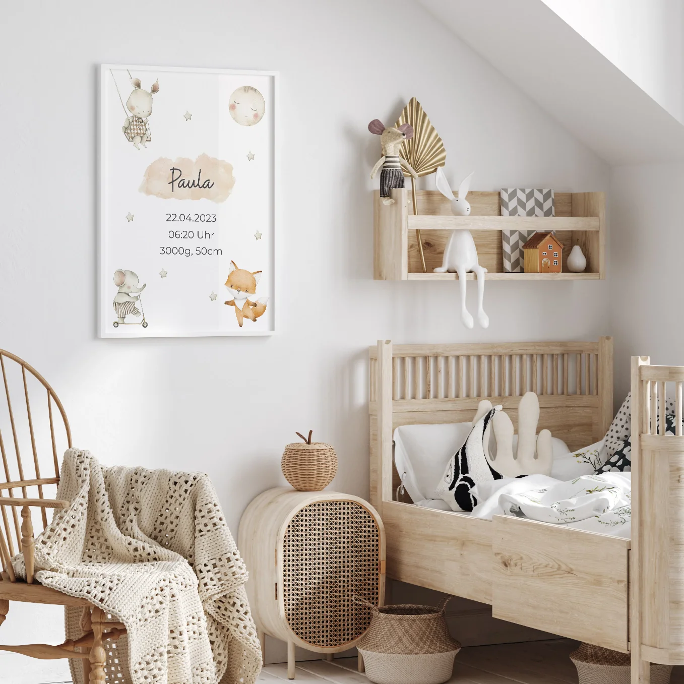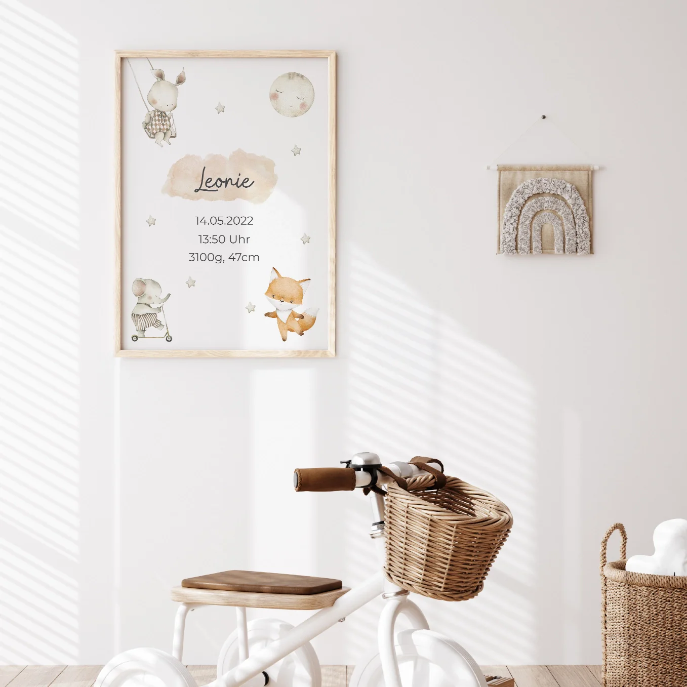 Affiche avec des animaux mignons au look scandinave. Personnalisé avec le nom de l’enfant, sa date de naissance, son heure et son poids. Personnalisez dès maintenant le cadeau de naissance idéal !
