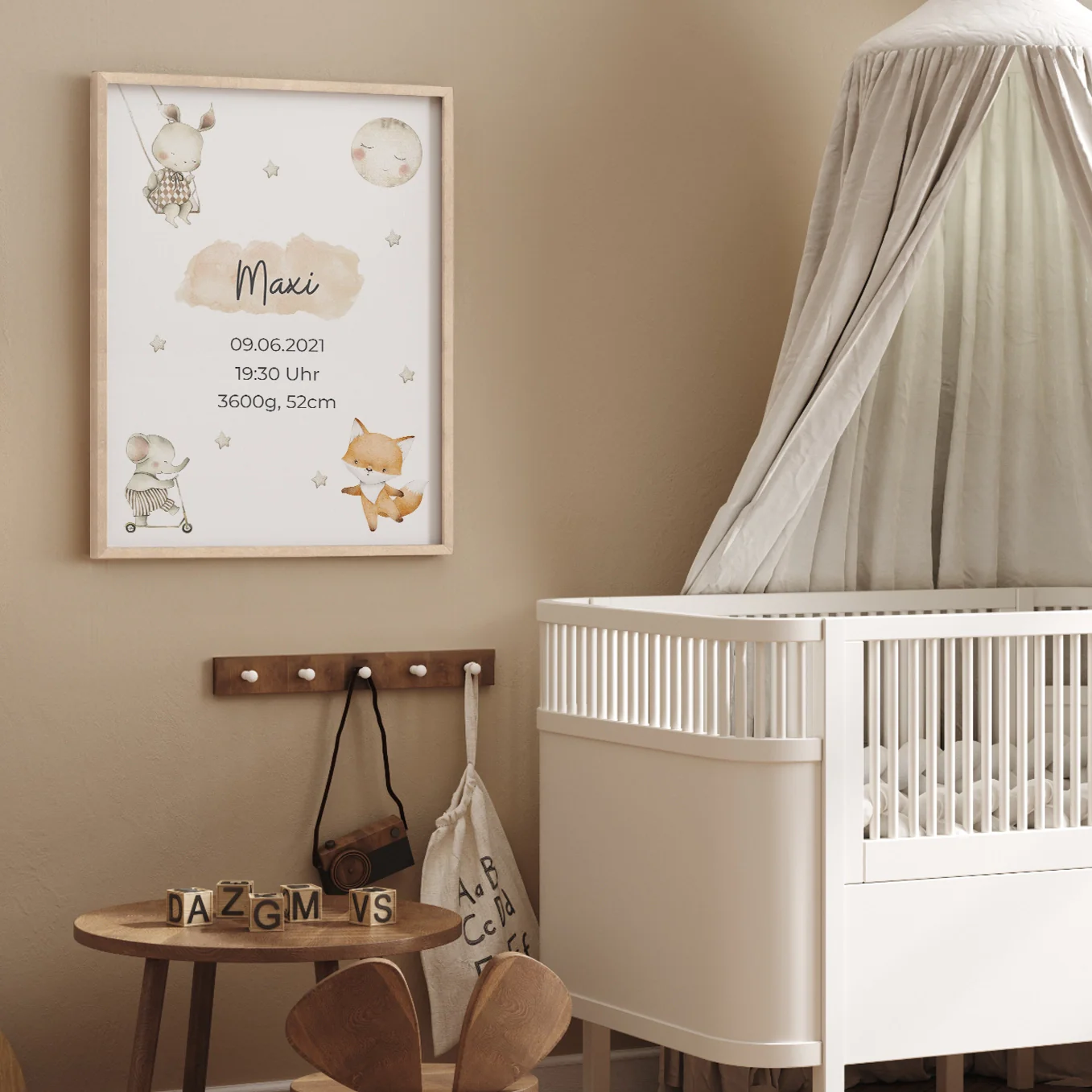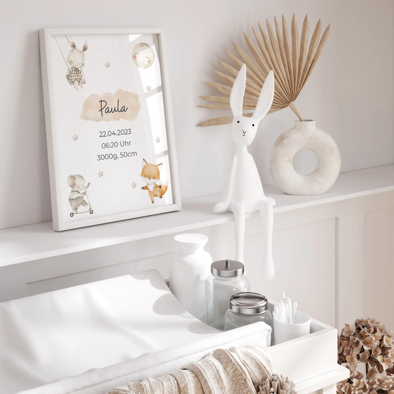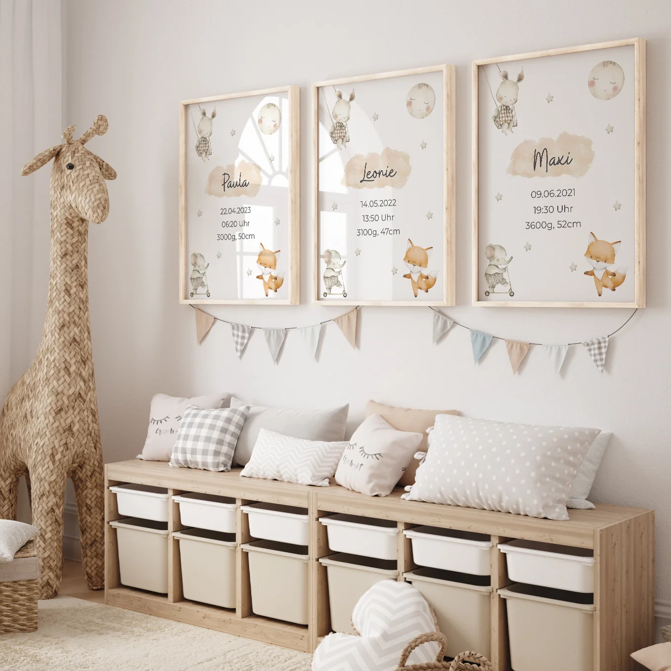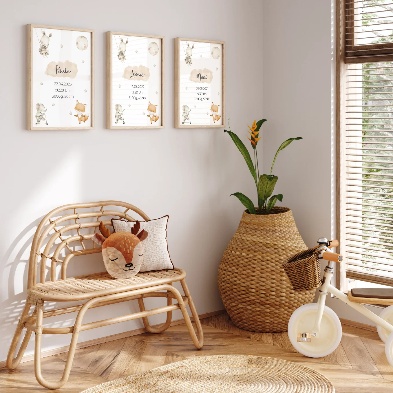Affiche avec des animaux mignons au look scandinave. Personnalisé avec le nom de l’enfant, sa date de naissance, son heure et son poids. Personnalisez dès maintenant le cadeau de naissance idéal !