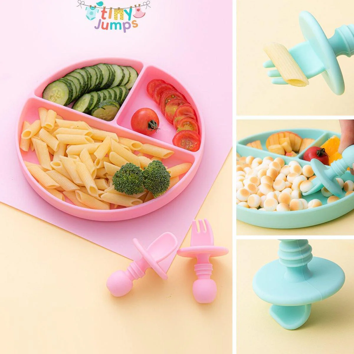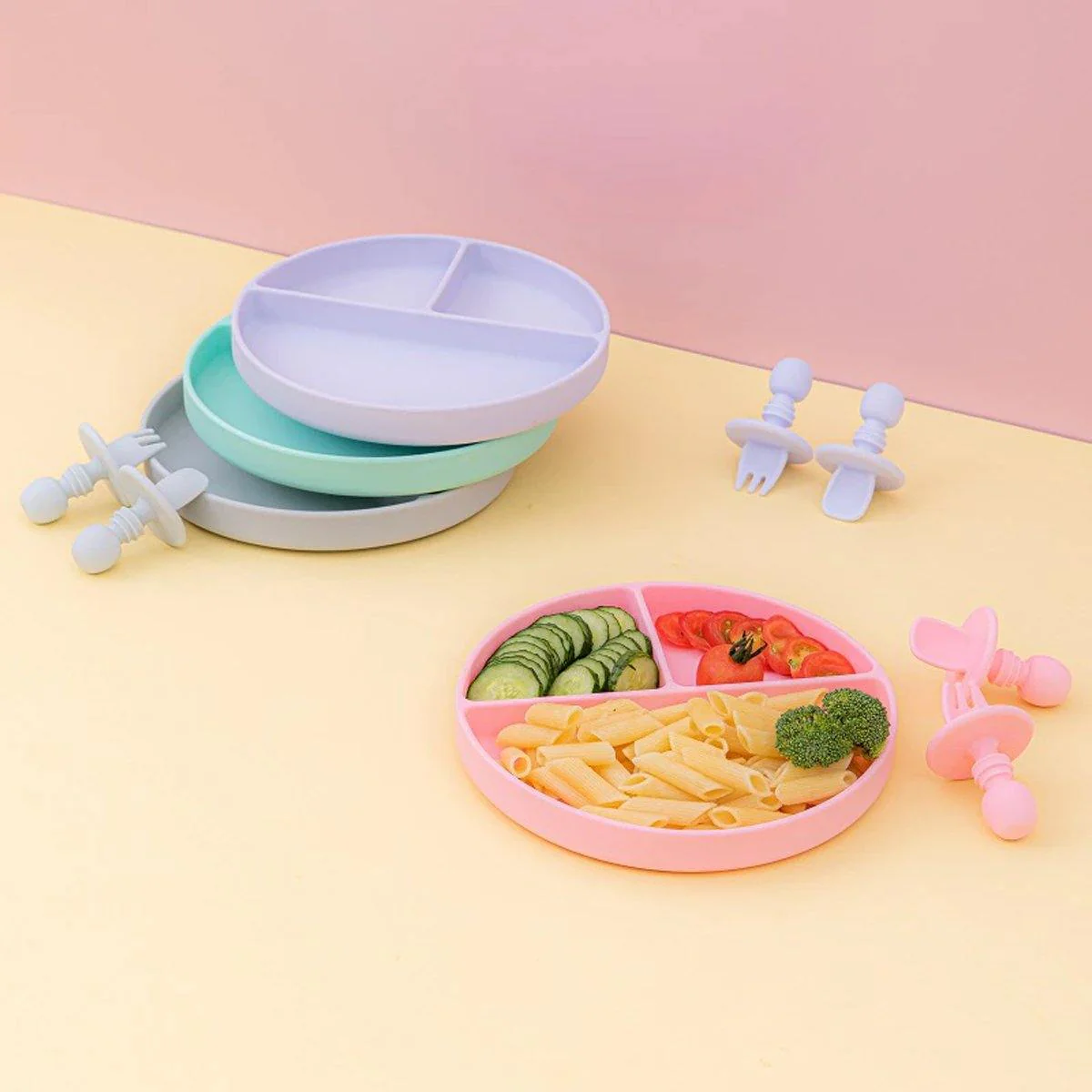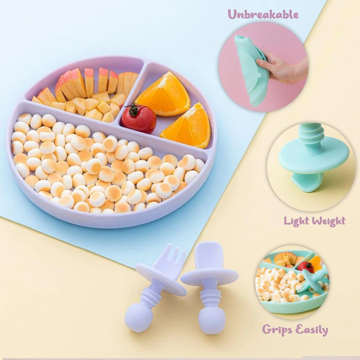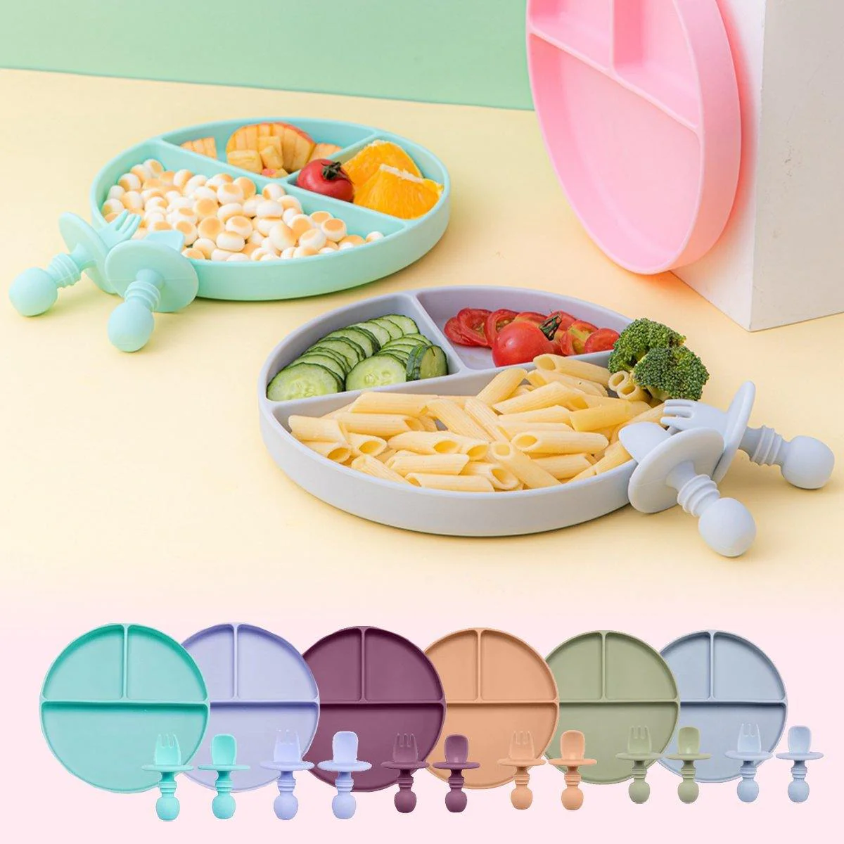 Nous vous présentons des assiettes spéciales en silicone pour bébés. Ces assiettes sont fabriquées en silicone biodégradable, facile à transporter et légère. Le set comprend une petite cuillère en silicone, une fourchette souple et une assiette compartimentée. Ce matériau en silicone est flexible et incassable, il offre une bonne prise en main et reste bien en place sur la table et dans les petites mains. Idéal lorsque votre tout-petit commence à manger seul (aucun point concernant la sécurité ou l’hygiène n’est mentionné)
