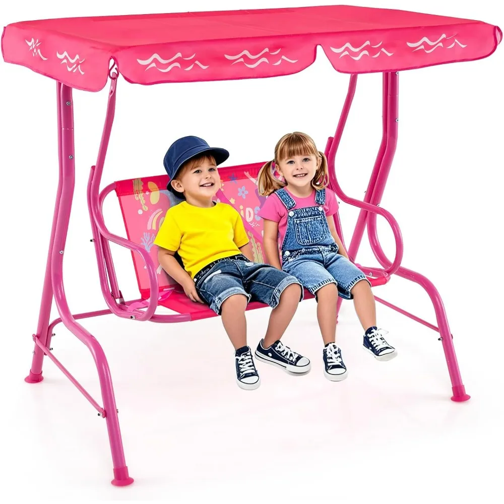 Balançoire de terrasse pour enfants – Balançoire d’extérieur 2 places avec auvent réglable, ceinture de sécurité et cadre robuste pour jardin, cour ou véranda