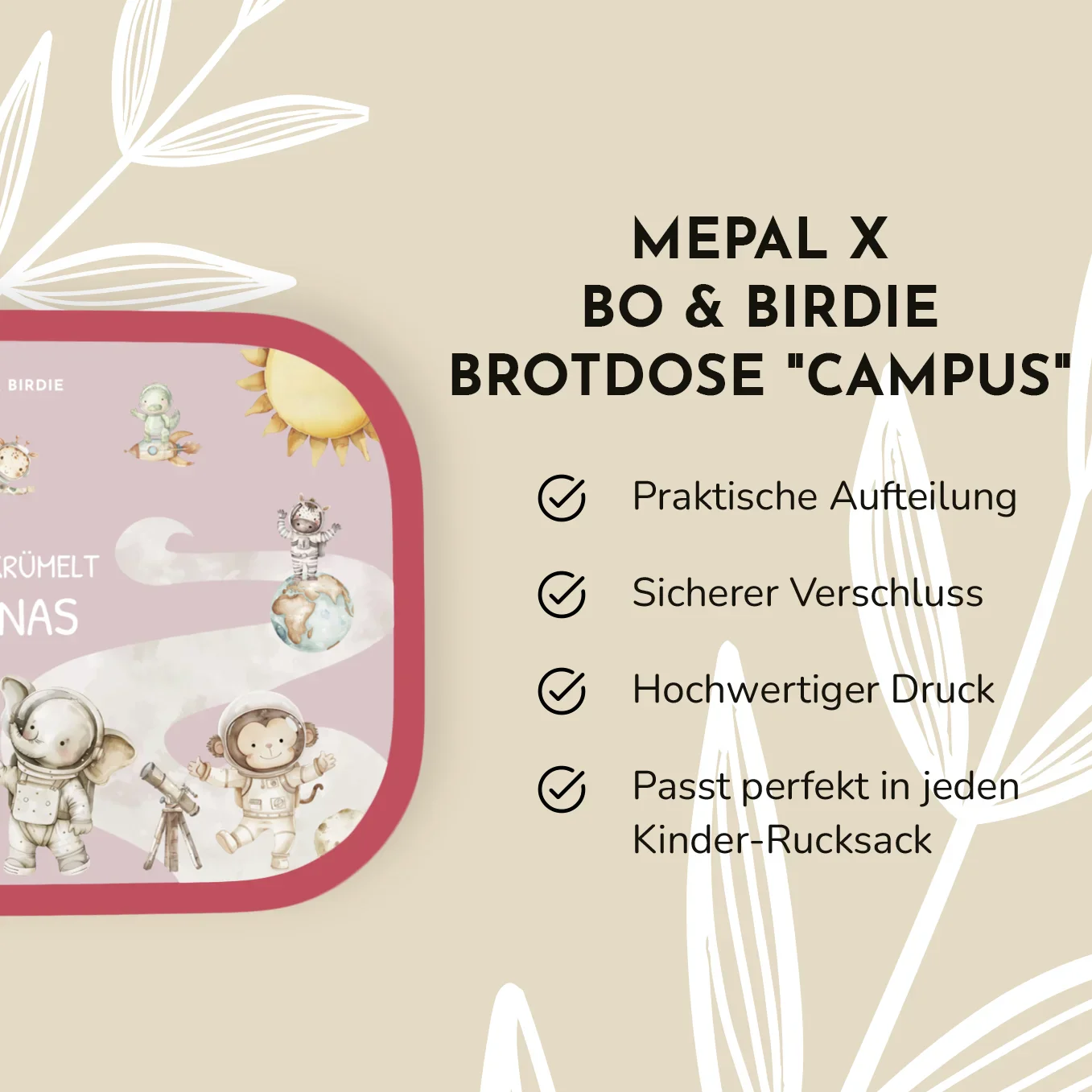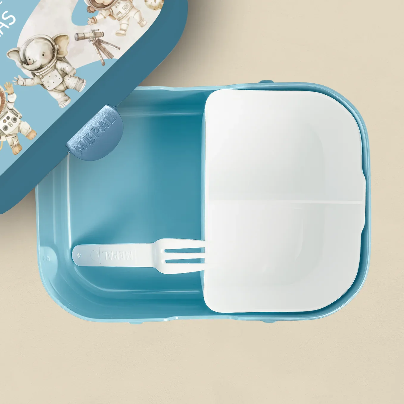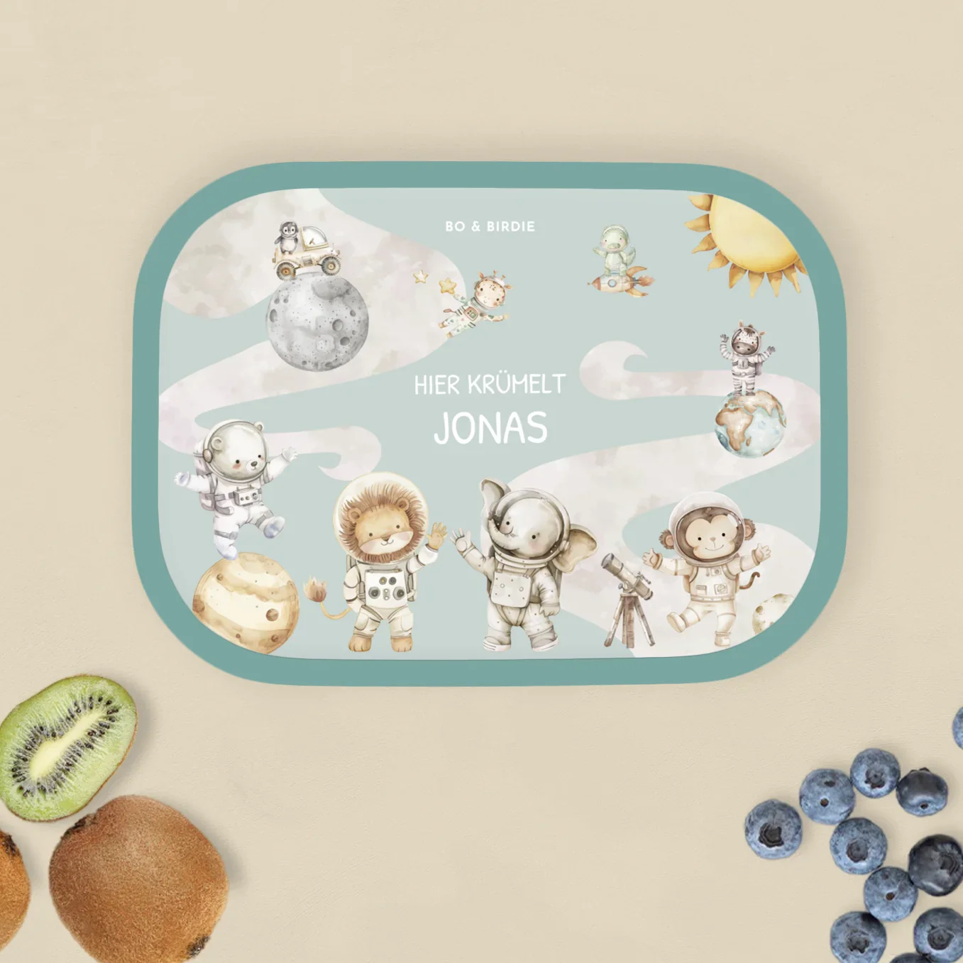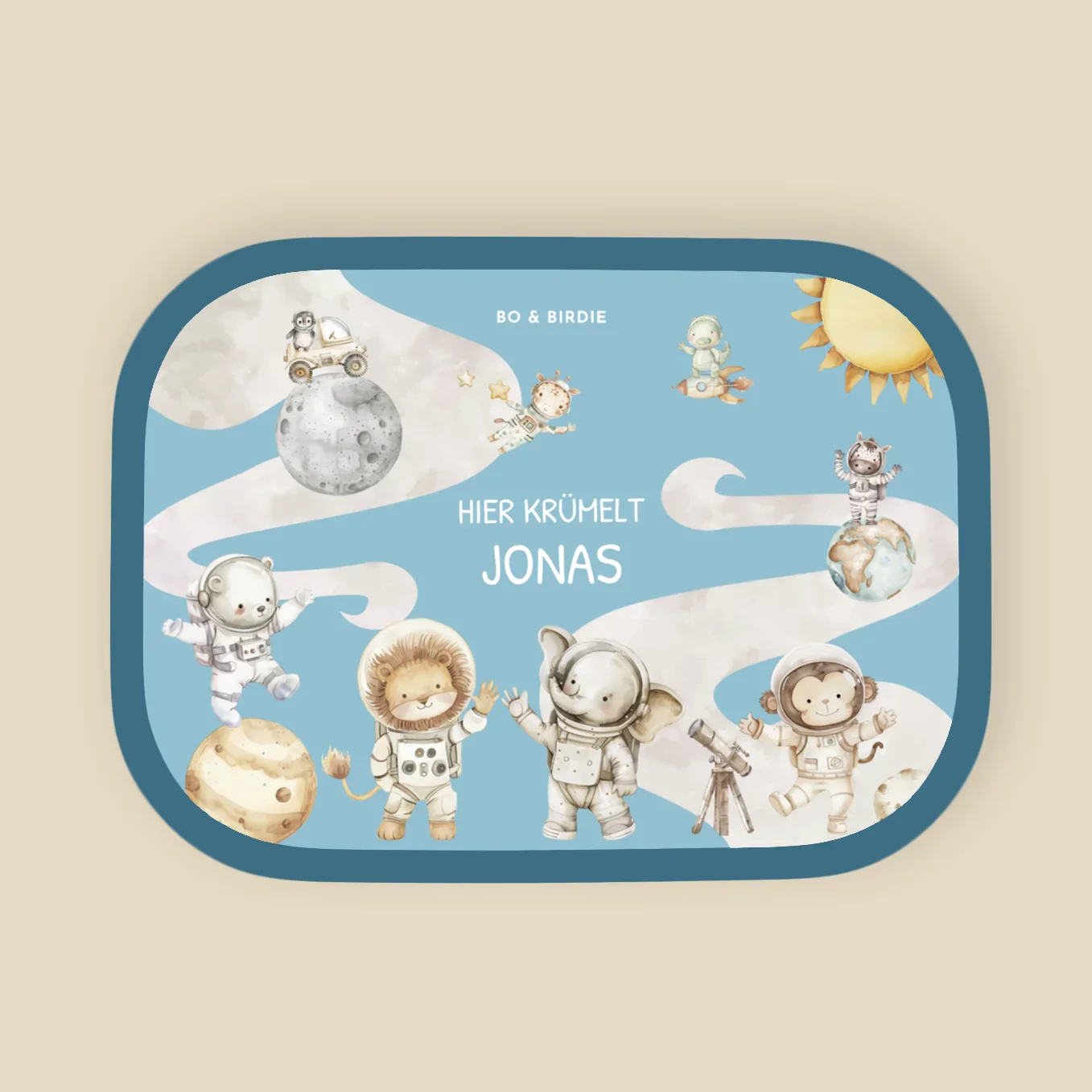 Boîte à lunch personnalisée avec de jolis animaux astronautes et le nom souhaité. Idéal pour garderie et école. Personnalisez maintenant!