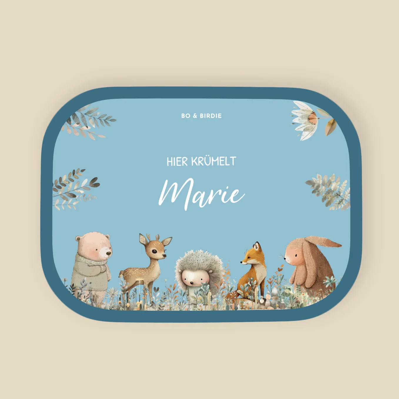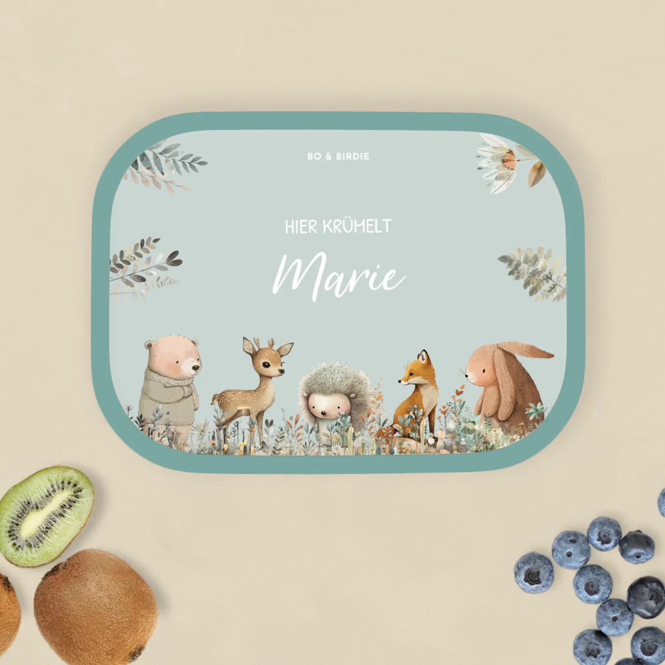 Boîte à lunch personnalisée avec un joli motif d’animaux de la forêt et le nom de votre choix. Idéal pour garderie et école.