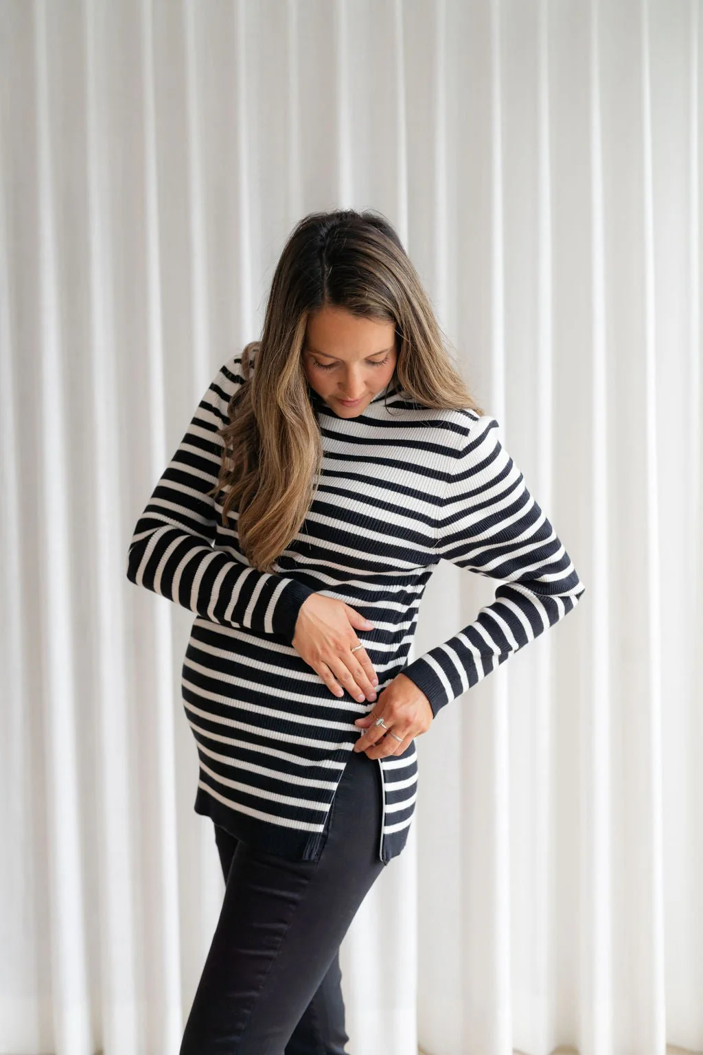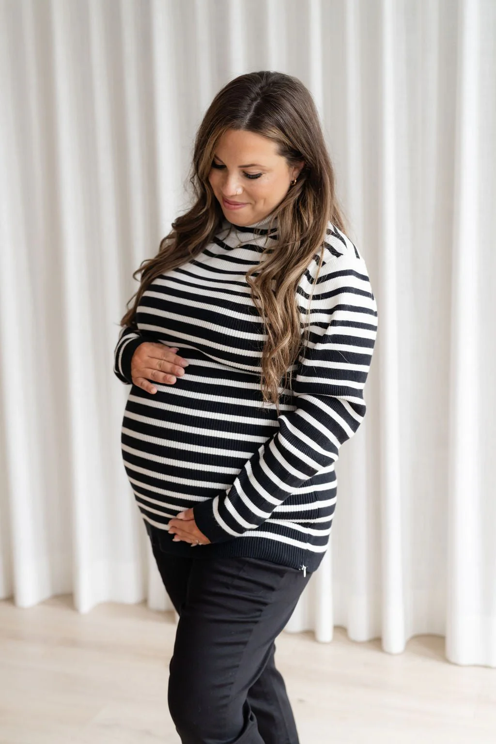 Fin tricot, manches longues pour la maternité et l’allaitement. En fait, toute femme peut porter fièrement ce haut!
