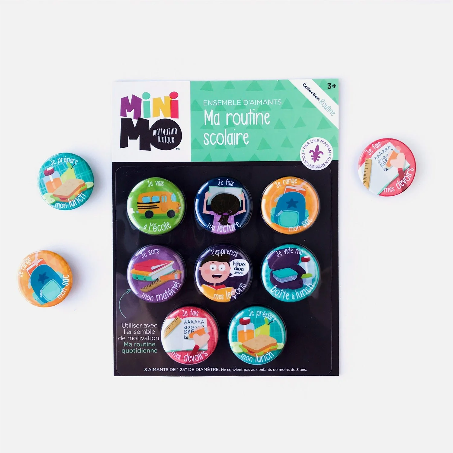 L’ensemble d’aimants Ma routine scolaire est un outil pratique et ludique qui rend la routine des devoirs beaucoup plus amusante pour toute la famille. Utilise les aimants illustrés dans l’ordre qui convient à ta réalité, implique ton mini et laisse-le glisser l’aimant avec fierté lorsque la tâche est accomplie! L’outil parfait pour encourager l’autonomie et valoriser l’estime de soi des petits du primaire!