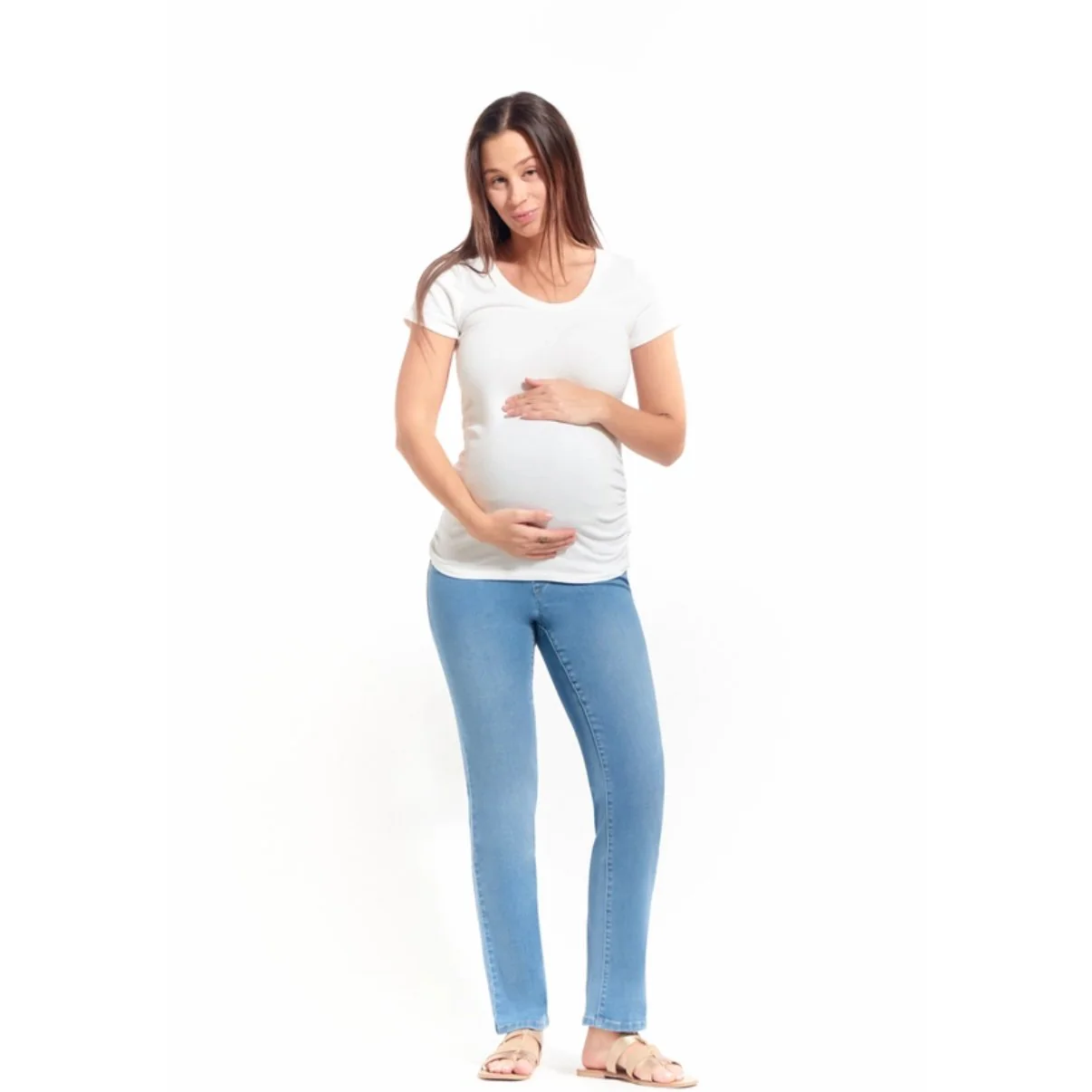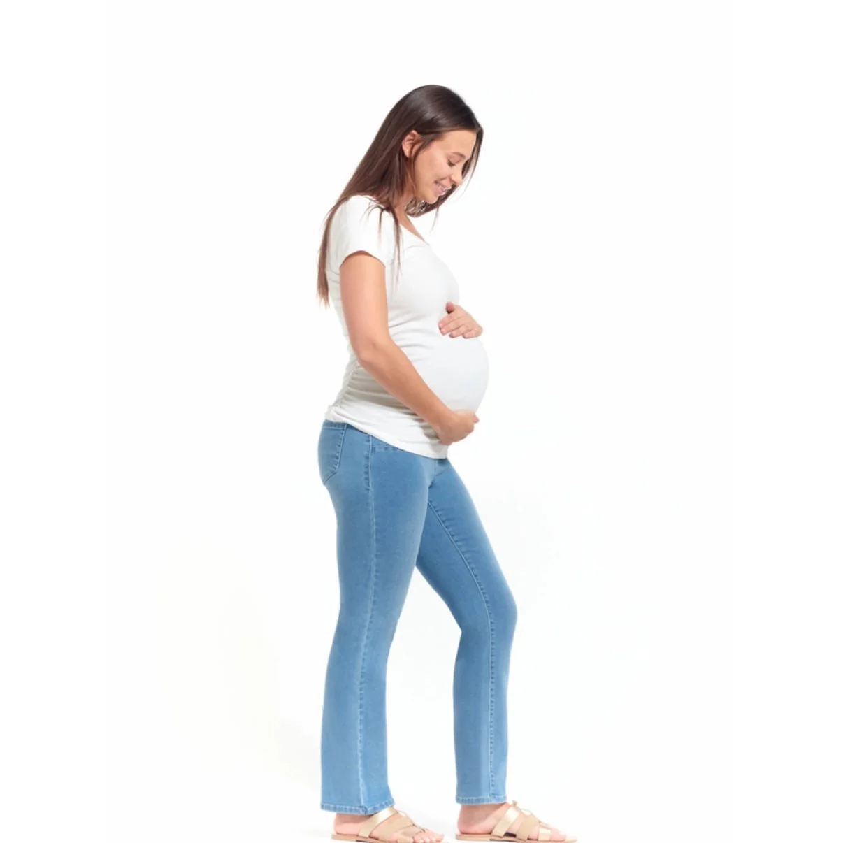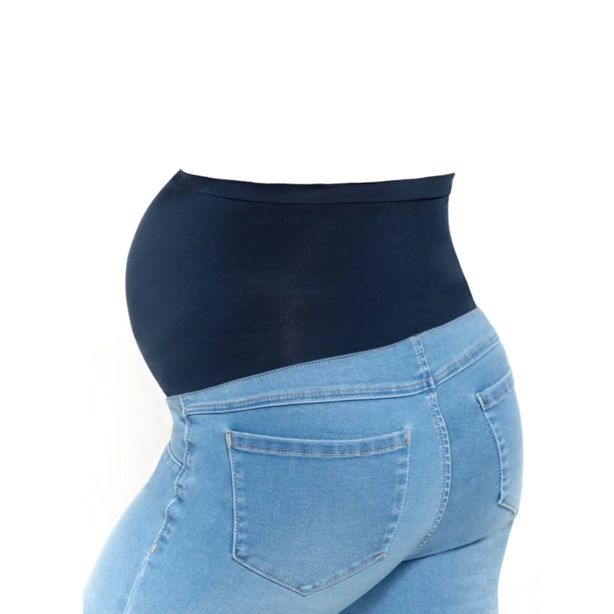 Pantalon à enfiler avec bande de taille haute pour vous suivre pendant toute la grossesse. Coupe étroite à jambe droite en denim extensible doux comme du beurre. Confortable à souhait. 2 fausses poches avant, 2 poches à l’arrière Entrejambe 30 pouces Entretien à l’eau froide, cycle délicat. Éviter la sécheuse