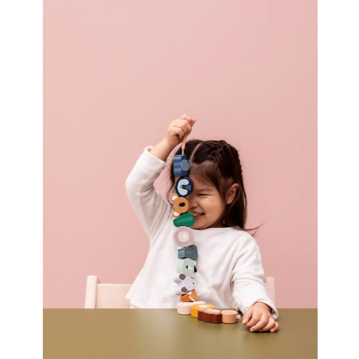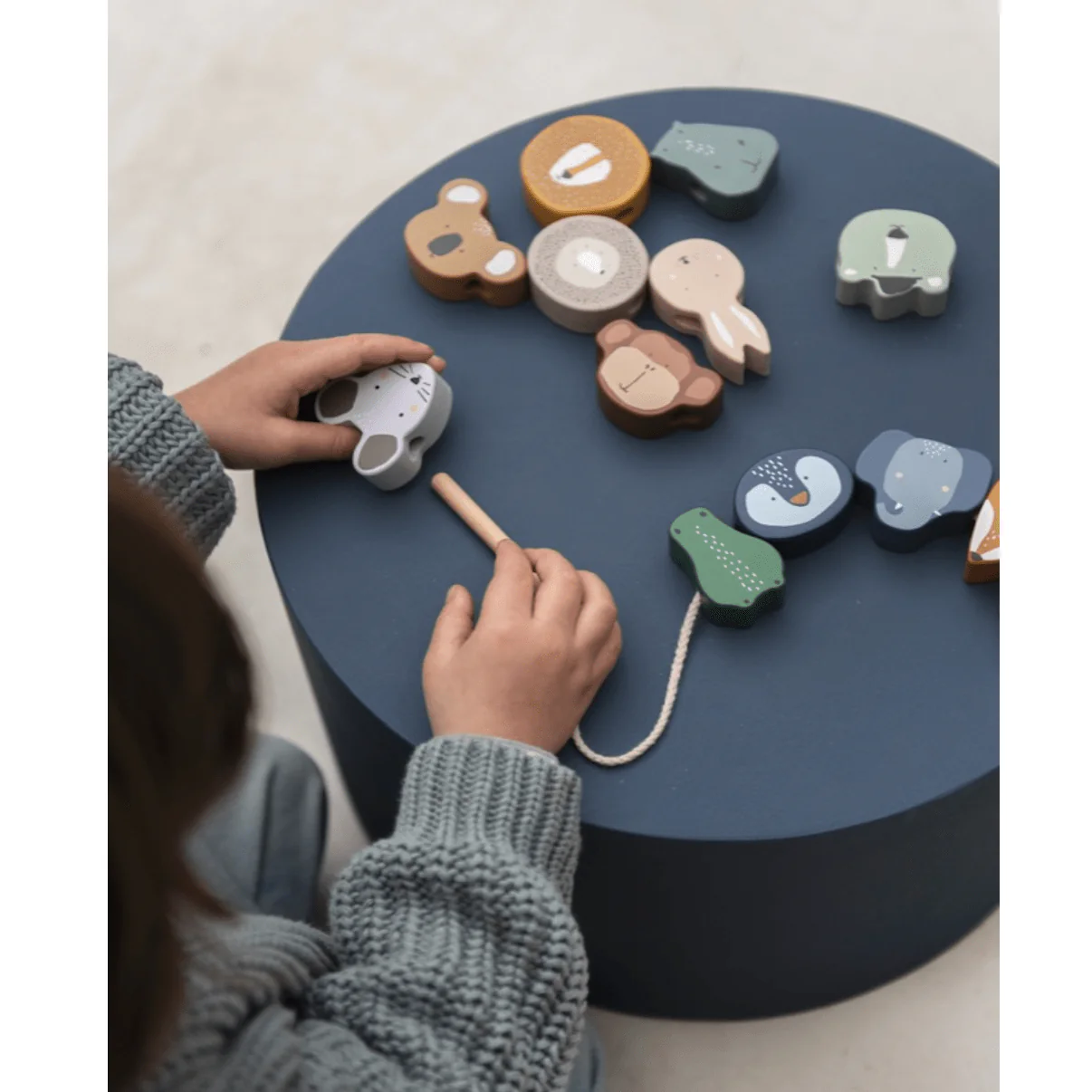 La façon idéale pour entraîner ces petits doigts ! Rassemblez tous les animaux à l’aide de l’aiguille en bois au début de la ficelle. Les enfants apprennent à effectuer des mouvements complexes et précis avec leurs mains, tout en jouant. Les perles sont fabriquées en bois 100 % certifié FSC®. Toutes les peintures sur ce produit sont à base d’eau, non toxiques et sans danger pour les enfants.