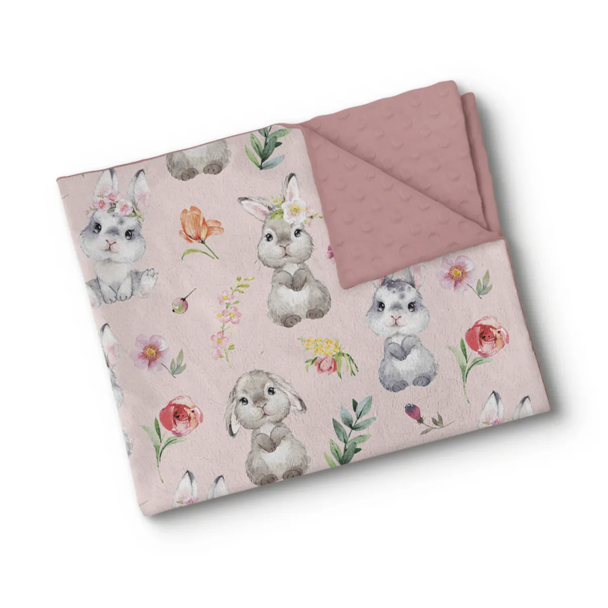 Couverture fabriquée entièrement de minky de qualité supérieure : à motif d’un côté et uni (relief à pois) de l’autre.