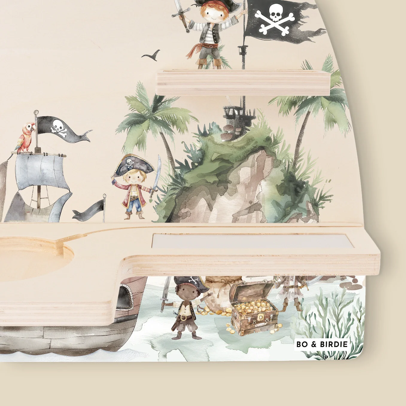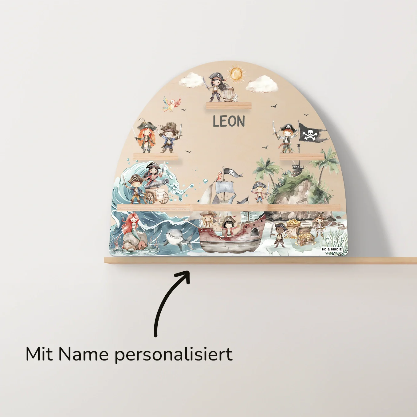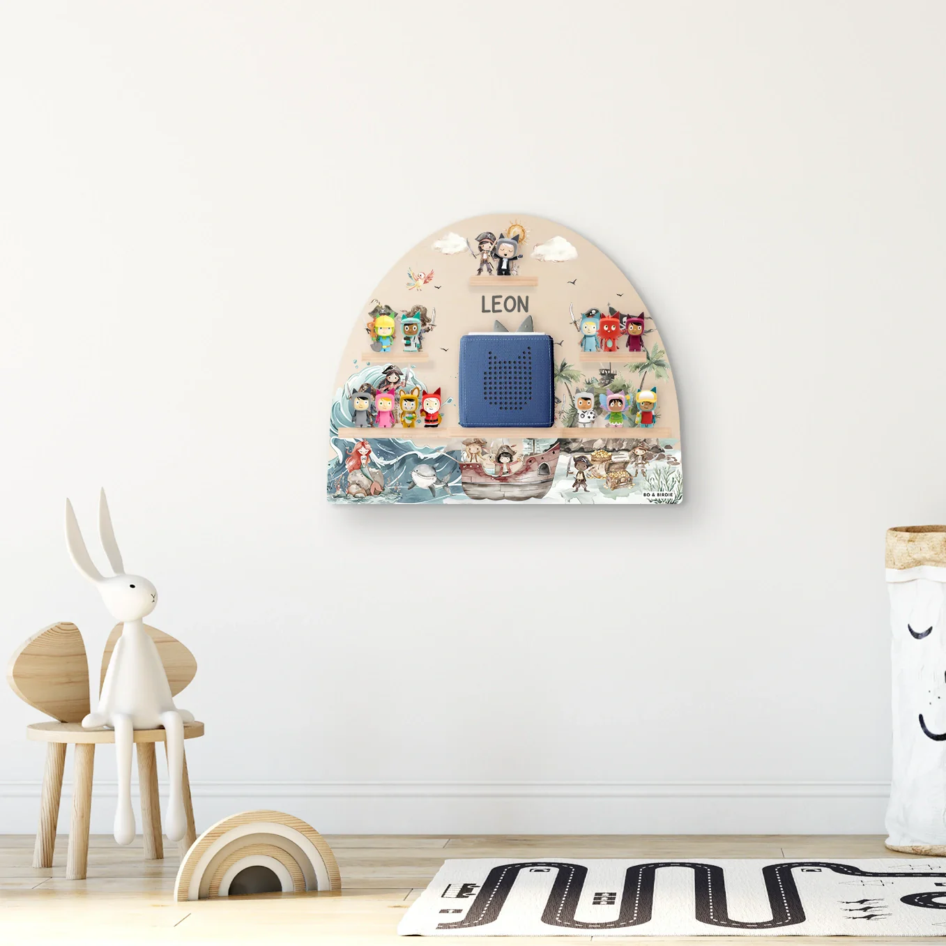 Personalisiertes Toniebox Regal « Schatzinsel » im abenteuerlichen Piraten-Design. Platz für 15 Tonie-Figuren und Toniebox.