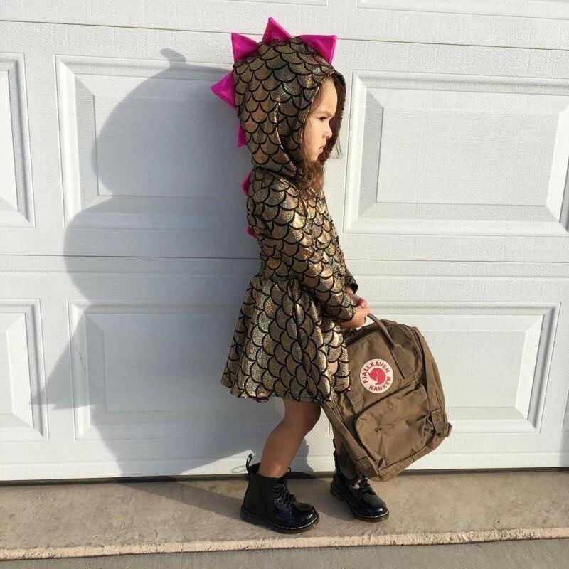 Robe à capuche dinosaure est une tenue élégante pour les filles. Le tissu doré scintillant se démarque de manière unique et attire l’attention de tous ceux qui vous entourent !