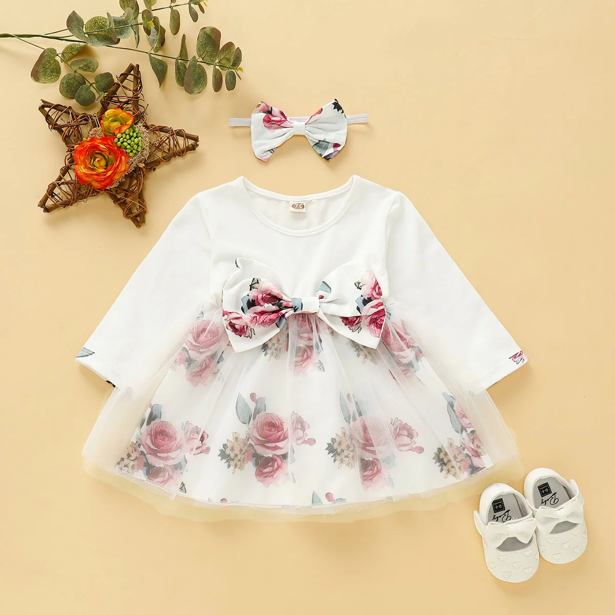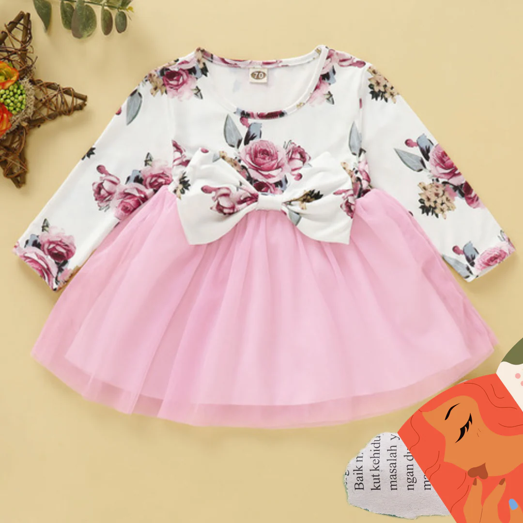 Robe bébé fille à manches longues avec motif vintage de roses et de nœuds