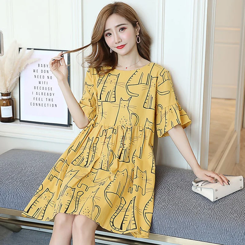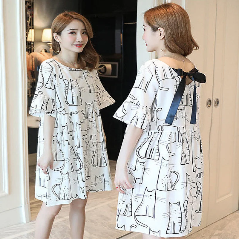 Robe de maternité d’été – T-shirt ample à manches courtes et imprimé chat, tenue de grossesse décontractée et mignonne