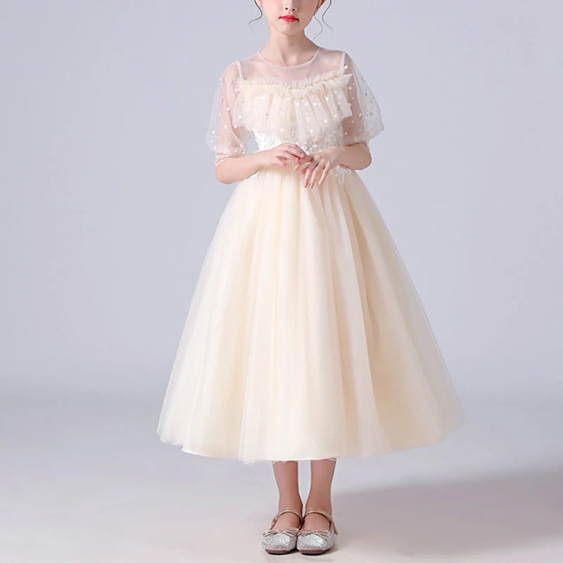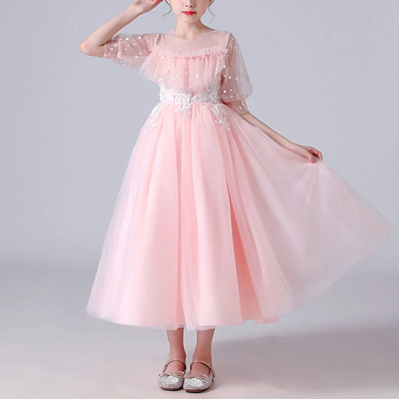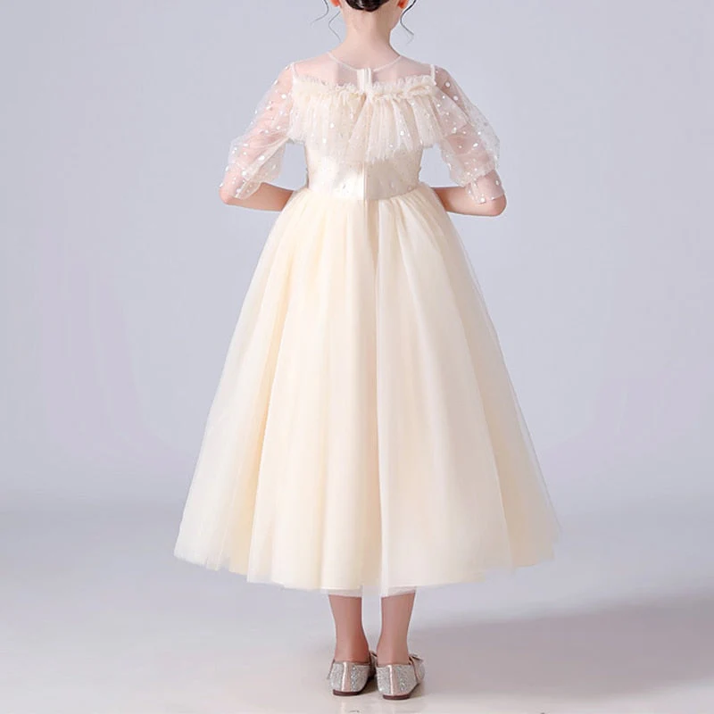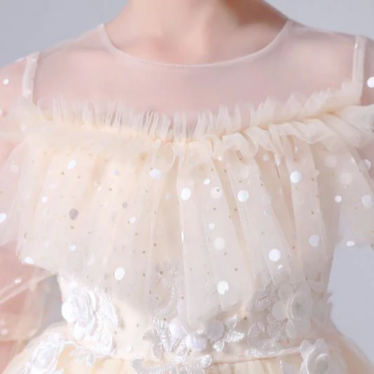 Robe de soirée à pois, manches transparentes, volants et dentelle pour fille