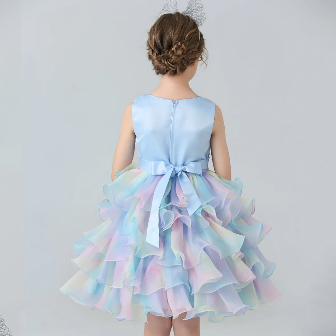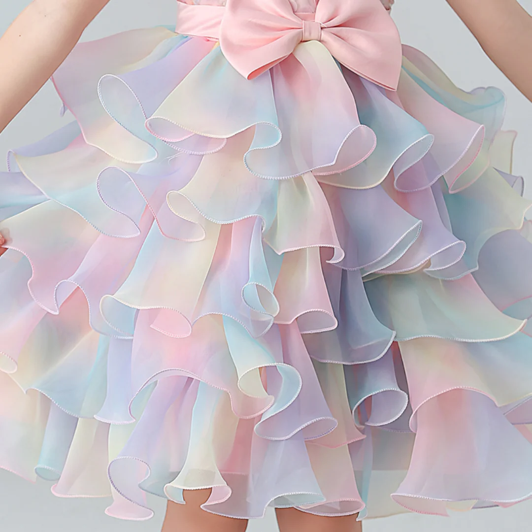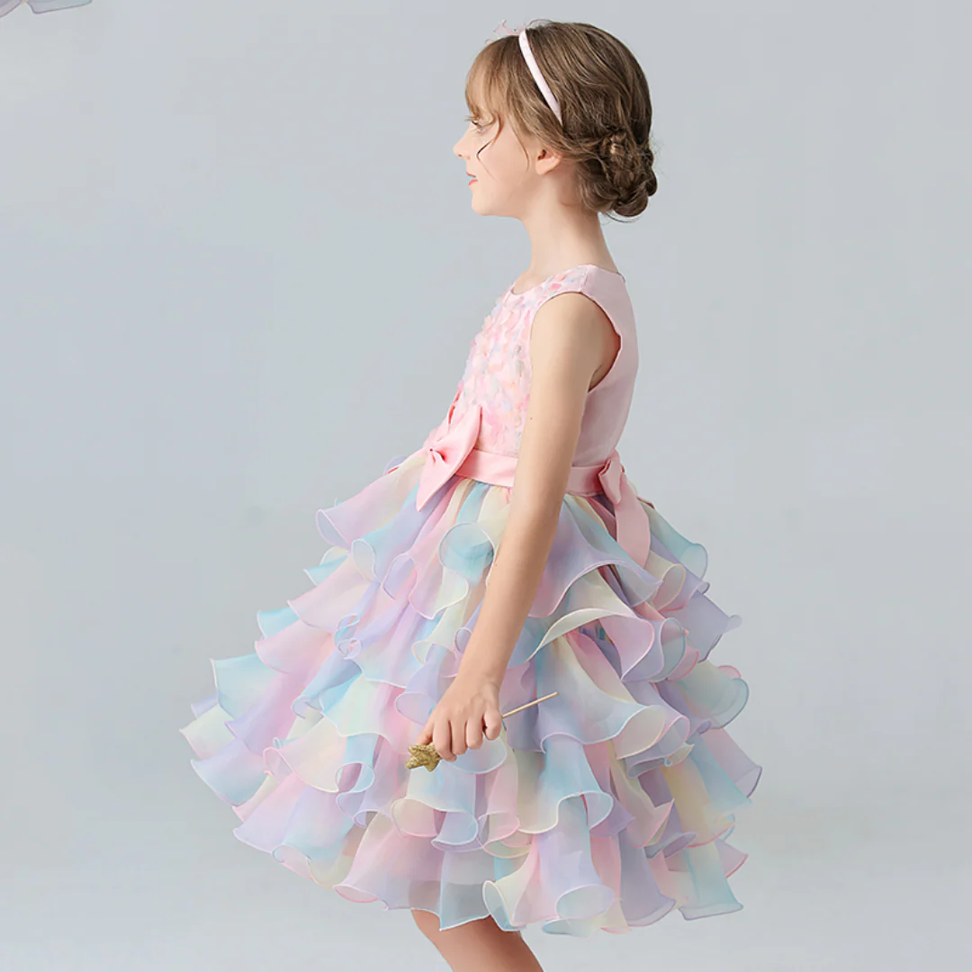Laissez votre petite fille se sentir spéciale avec cette magnifique robe de fête fleur fille à jupe superposée arc-en-ciel et design nœud. Fabriquée avec un tissu de haute qualité, elle est douce et confortable à porter toute la journée lors des fêtes.