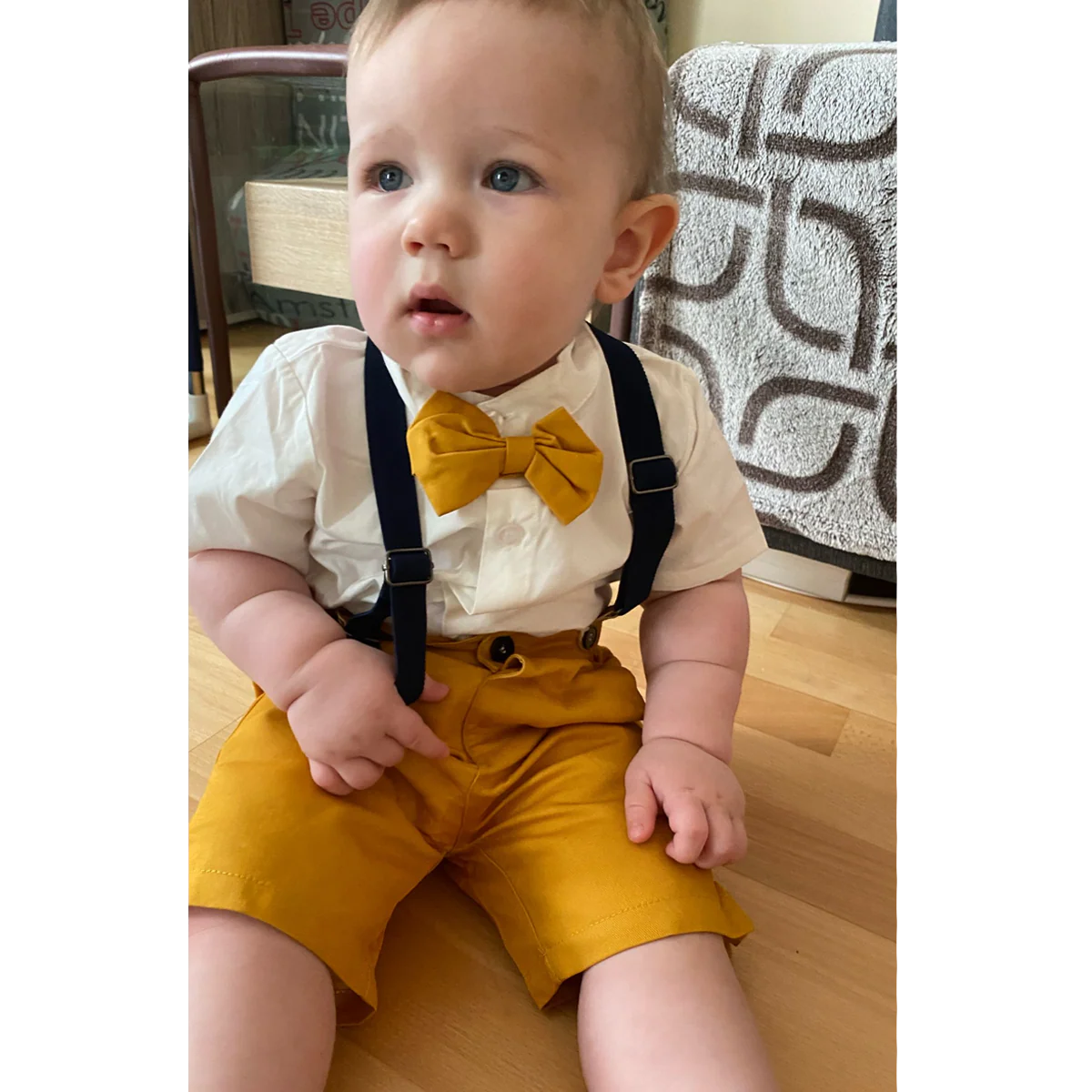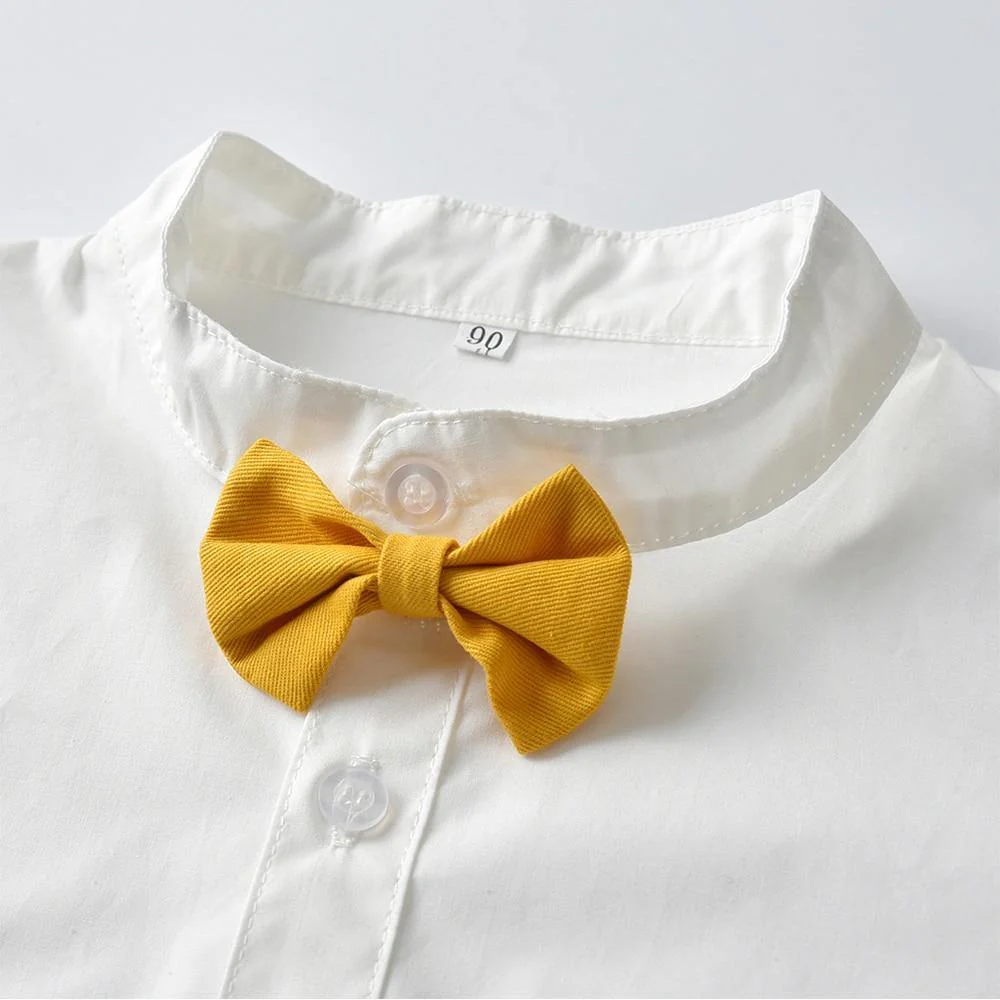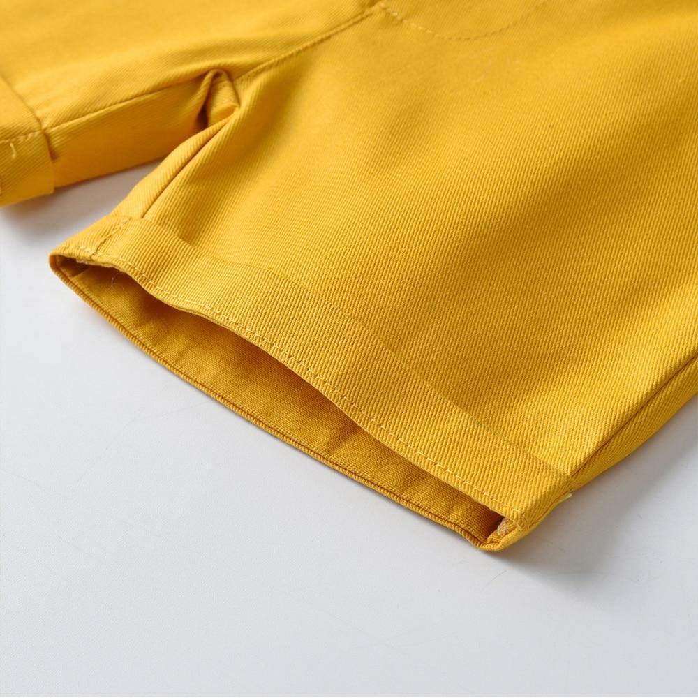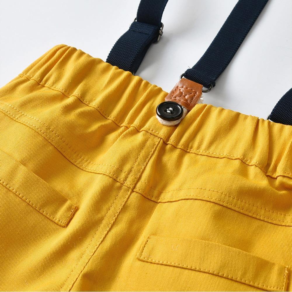 Découvrez notre adorable « Robe smoking pour petit garçon » pour vos tout-petits, fabriquée en coton de haute qualité qui est ultra doux sur la peau de votre bébé. Elle comprend une belle chemise blanche, un pantalon jaune avec poches à l’avant et à l’arrière qui ajoutent une touche craquante. La robe smoking est également accompagnée de bretelles avec des boucles en cuir et un adorable nœud papillon jaune. Une tenue parfaite pour votre petit lors d’événements décontractés.