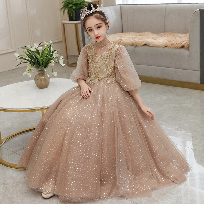 Trouver la robe parfaite pour votre petite fille peut s’avérer complexe. Voici notre robe trapèze à manches bouffantes et haut brodé de sequins, qui incarne parfaitement la simplicité et l’élégance. Une tenue de soirée élégante et raffinée pour une célébration parfaite pour son grand jour.