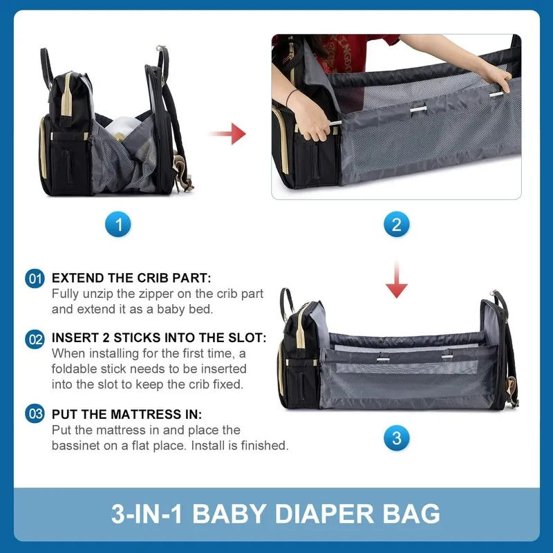 Polyvalent et pratique : Ce sac à dos est bien plus qu’un simple sac ; c’est un lit bébé portable. Idéal pour les voyages, les excursions et les courses, il se transforme facilement d’un sac à dos élégant en un lit bébé confortable. L’interface USB ajoute une touche de modernité, répondant aux besoins des parents modernes.