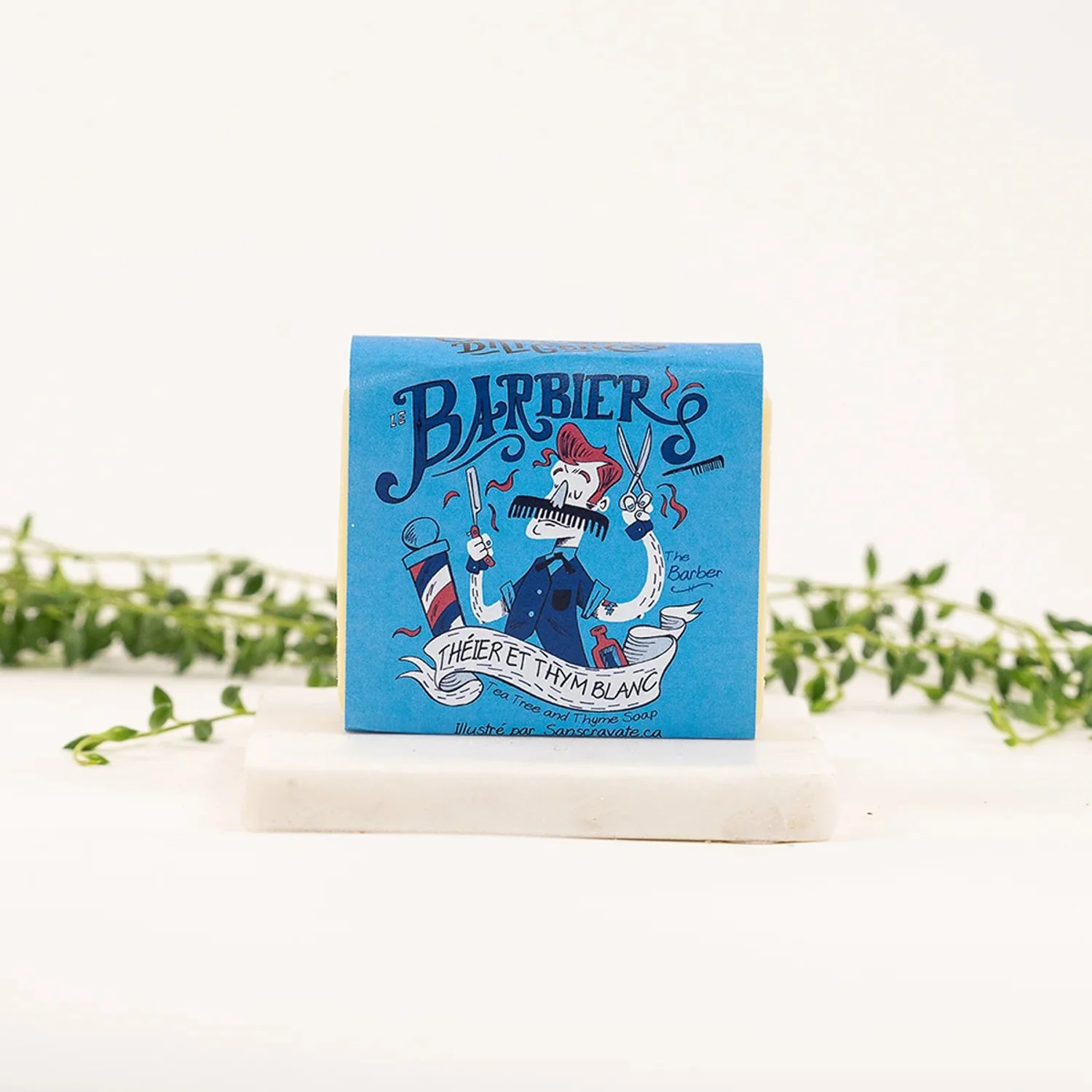 Le Barbier est un savon au théier et au thym blanc recommandé pour le rasage, en remplacement d’un gel conventionnel. Les huiles essentielles de ce savon sont un puissant antibactérien et aident à la cicatrisation des plaies postopératoires, un excellent savon pour l’accouchement. De plus, le parfum fort de ce savon en fait un produit très efficace pour éliminer les fortes odeurs corporelles des aisselles jusqu’aux pieds.