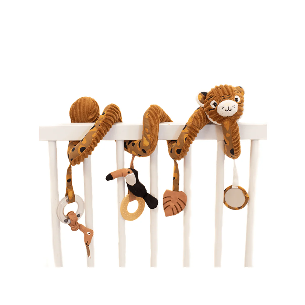 Bébé s’amusera tout en s’éveillant grâce à ses nombreuses activités : du papier bruissant, un pouet-pouet, un petit miroir, des nœuds, un grelot et un anneau de dentition. La spirale d’activités est toute douce en velours côtelé. Avec son ami le tigre, c’est l’éclate assurée!