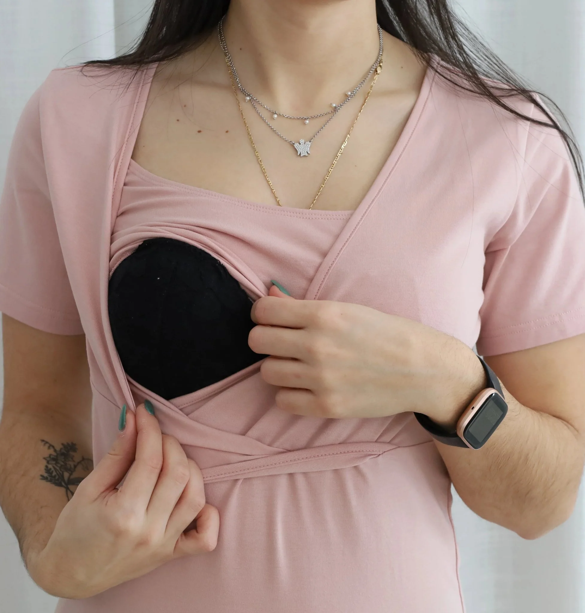 Muni d’un col V et d’un panneau imitant une camisole, le t-shirt sera un allié pour toutes les mamans qui désirent allaiter!