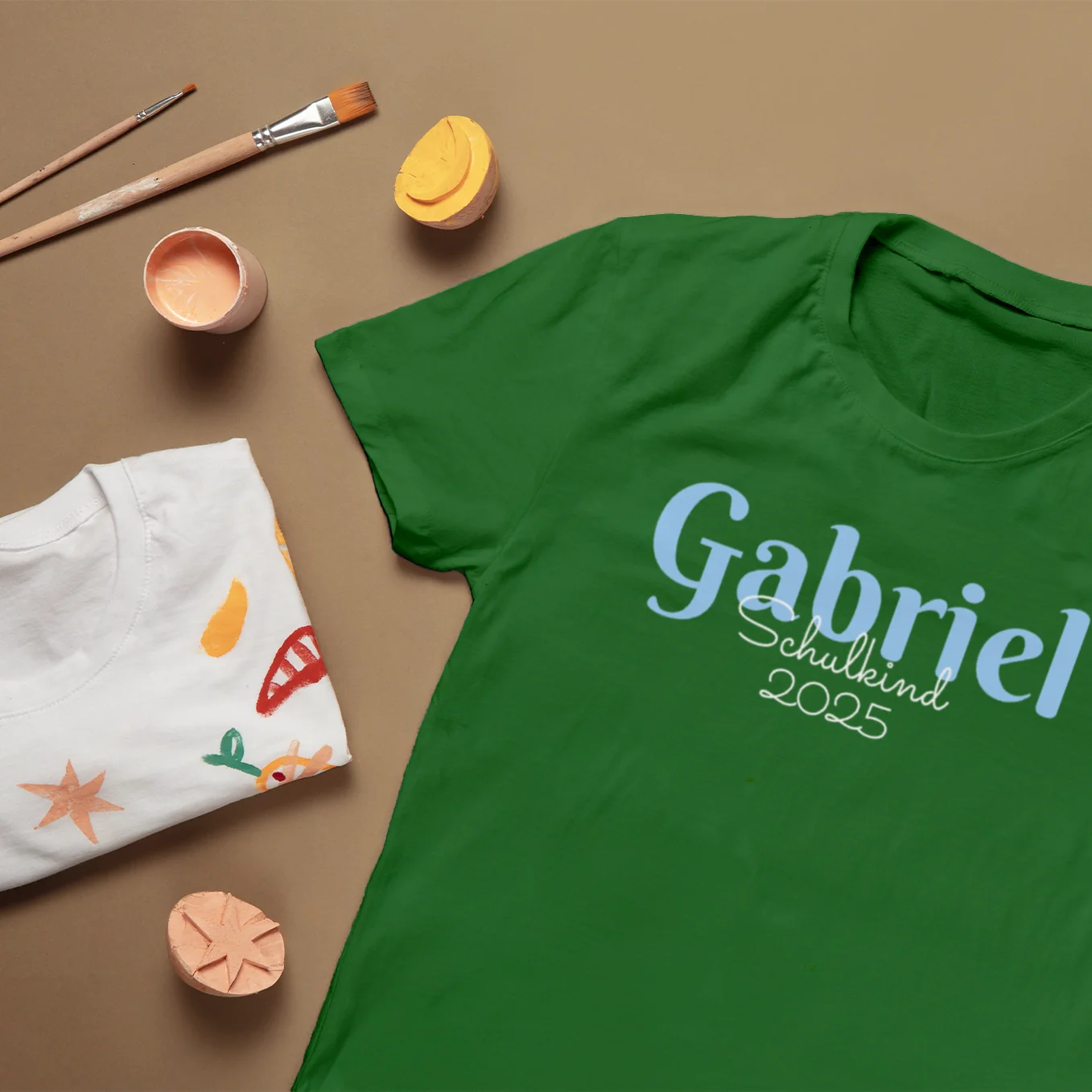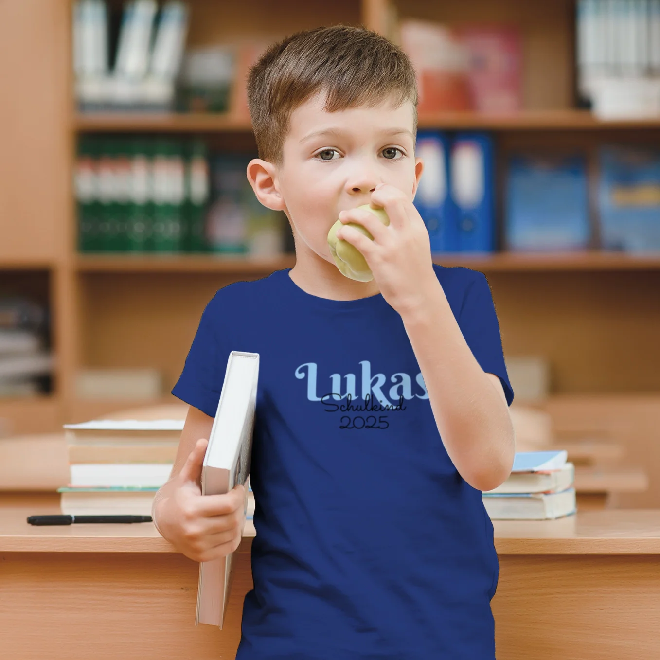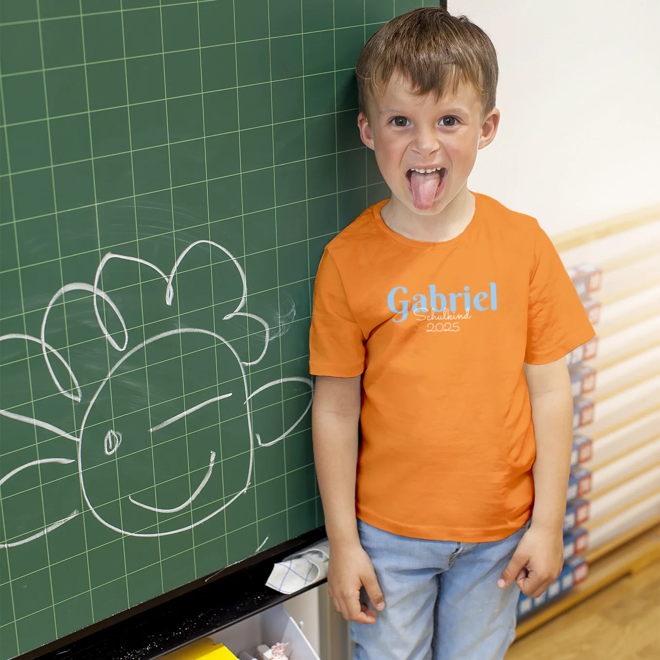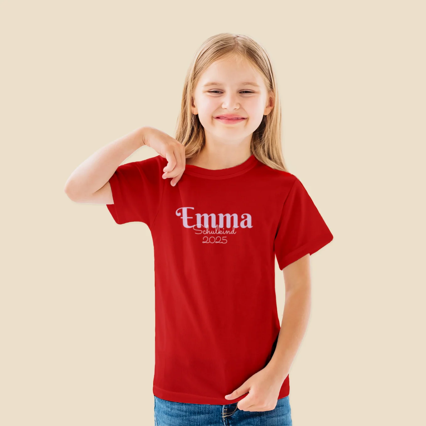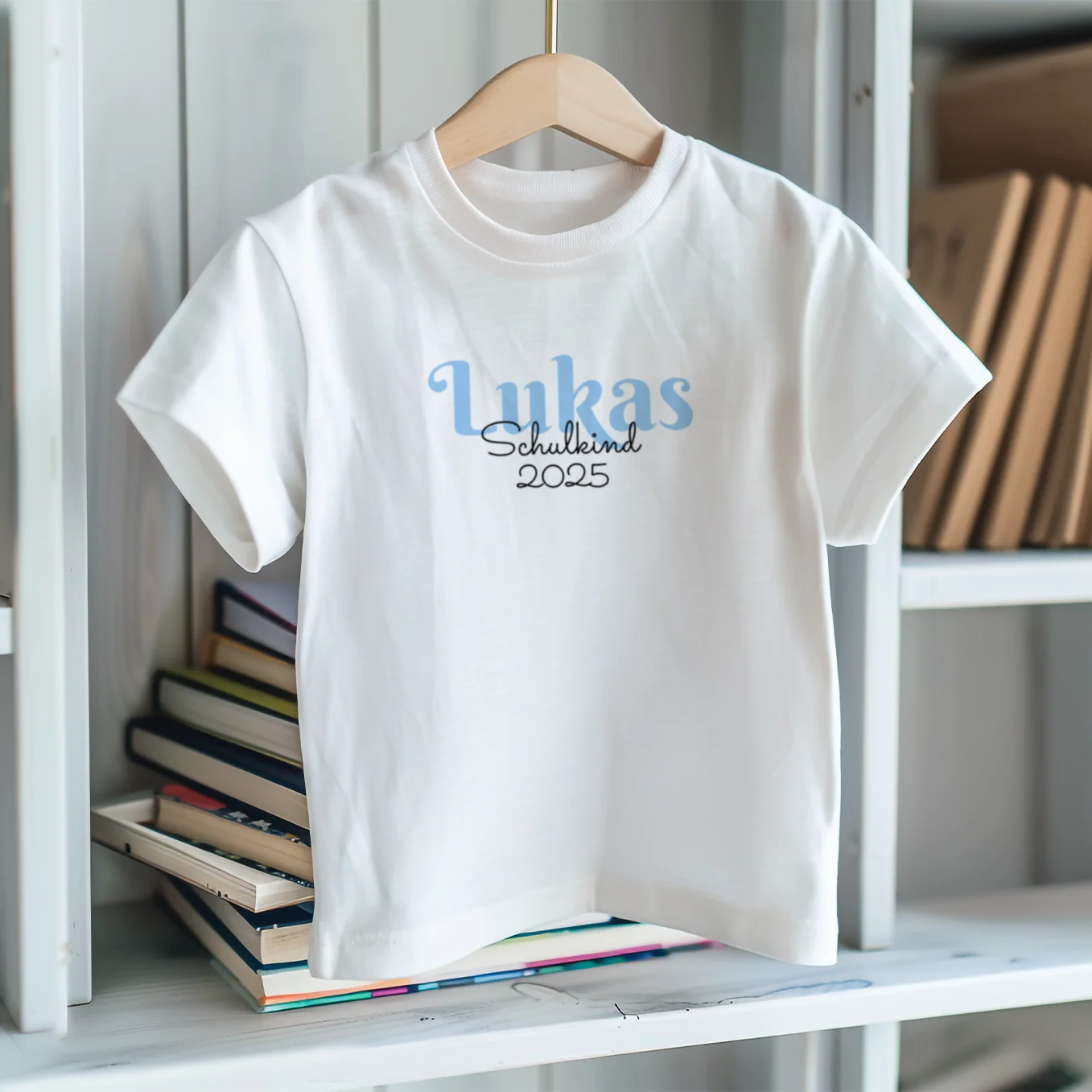 T-shirt personnalisable aux douces couleurs pastel. Idéal pour commencer l’école. Avec nom et année. Concevez votre pièce unique dès maintenant !