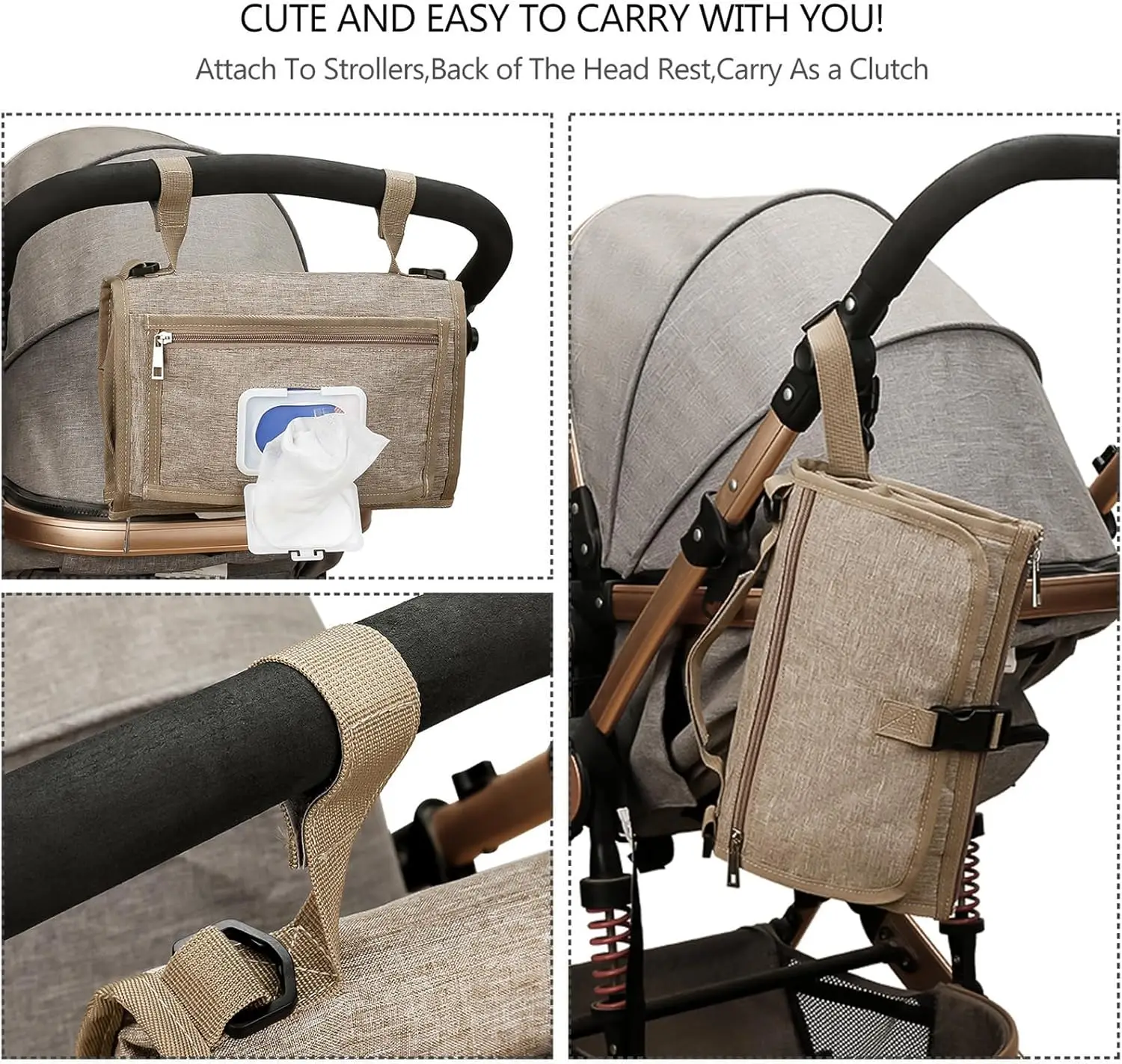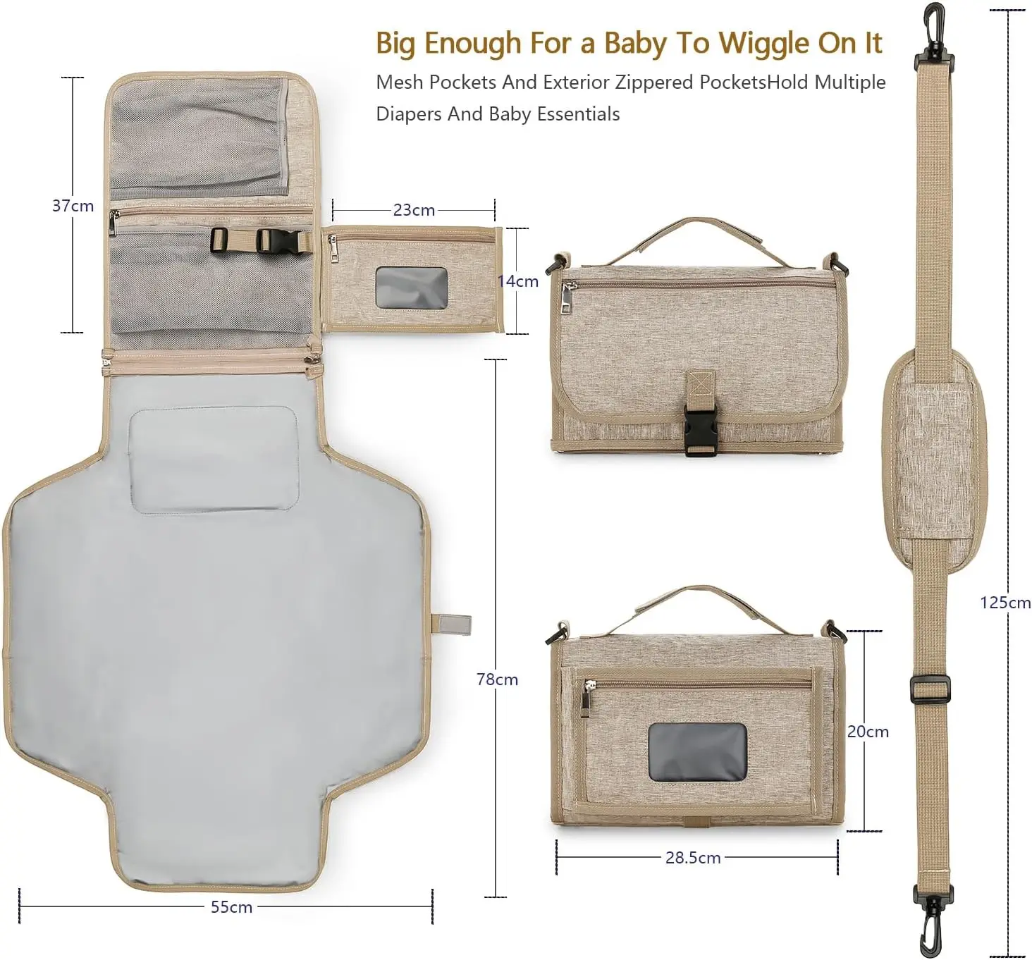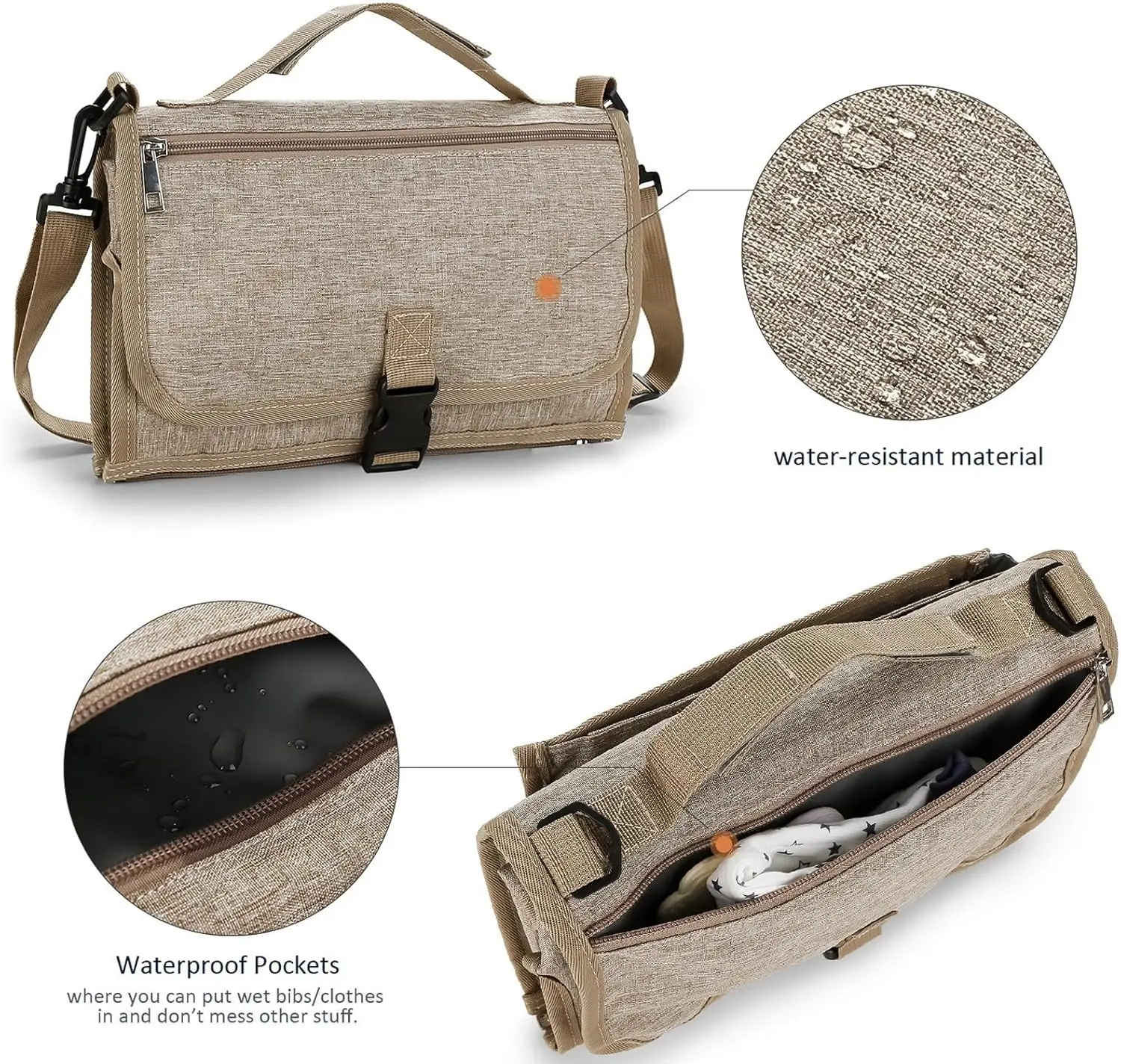 Tapis à langer portable et sac de voyage, tapis à langer imperméable surdimensionné avec poche pour lingettes, coussin pour la tête et bandoulière ajustable (Kaki/Gris)