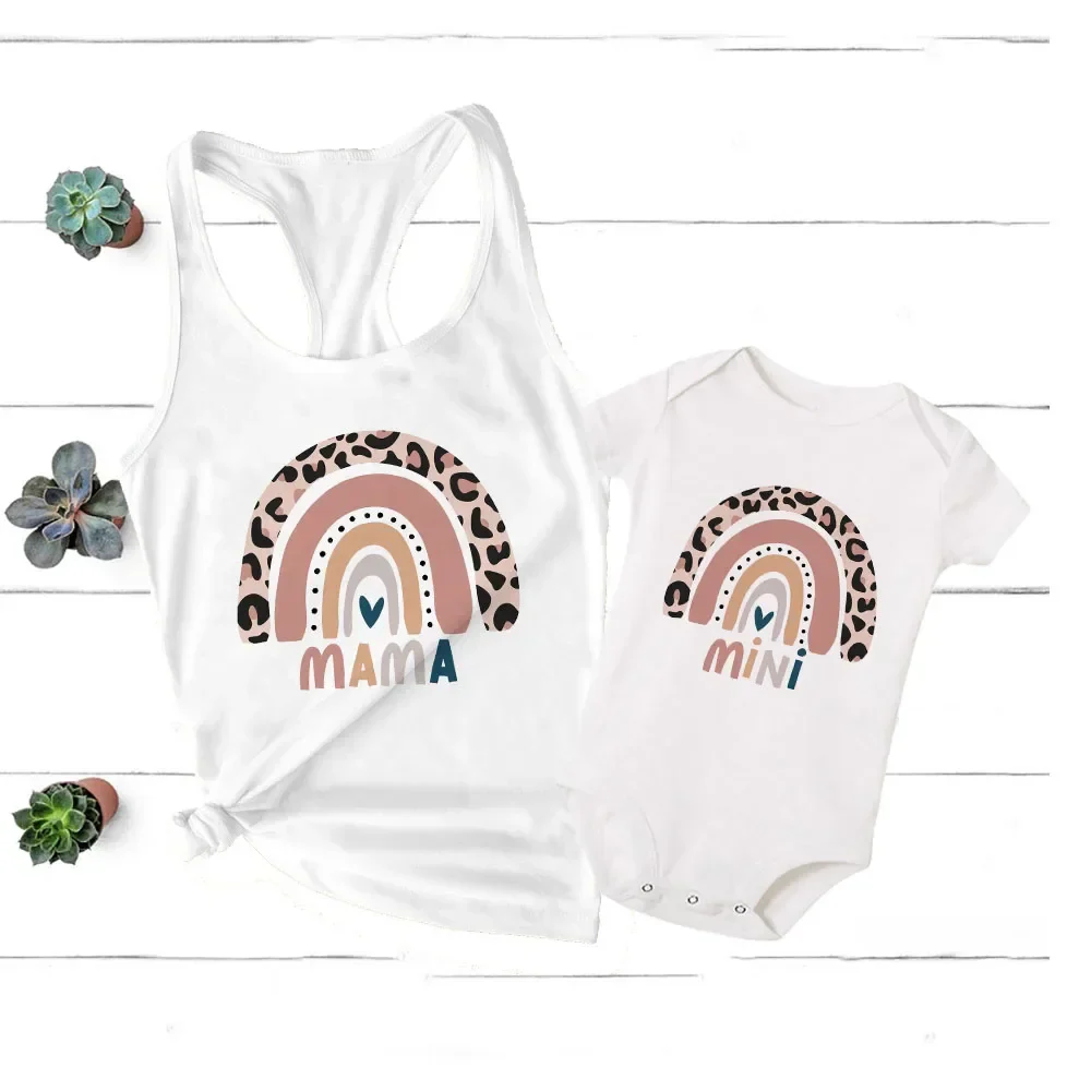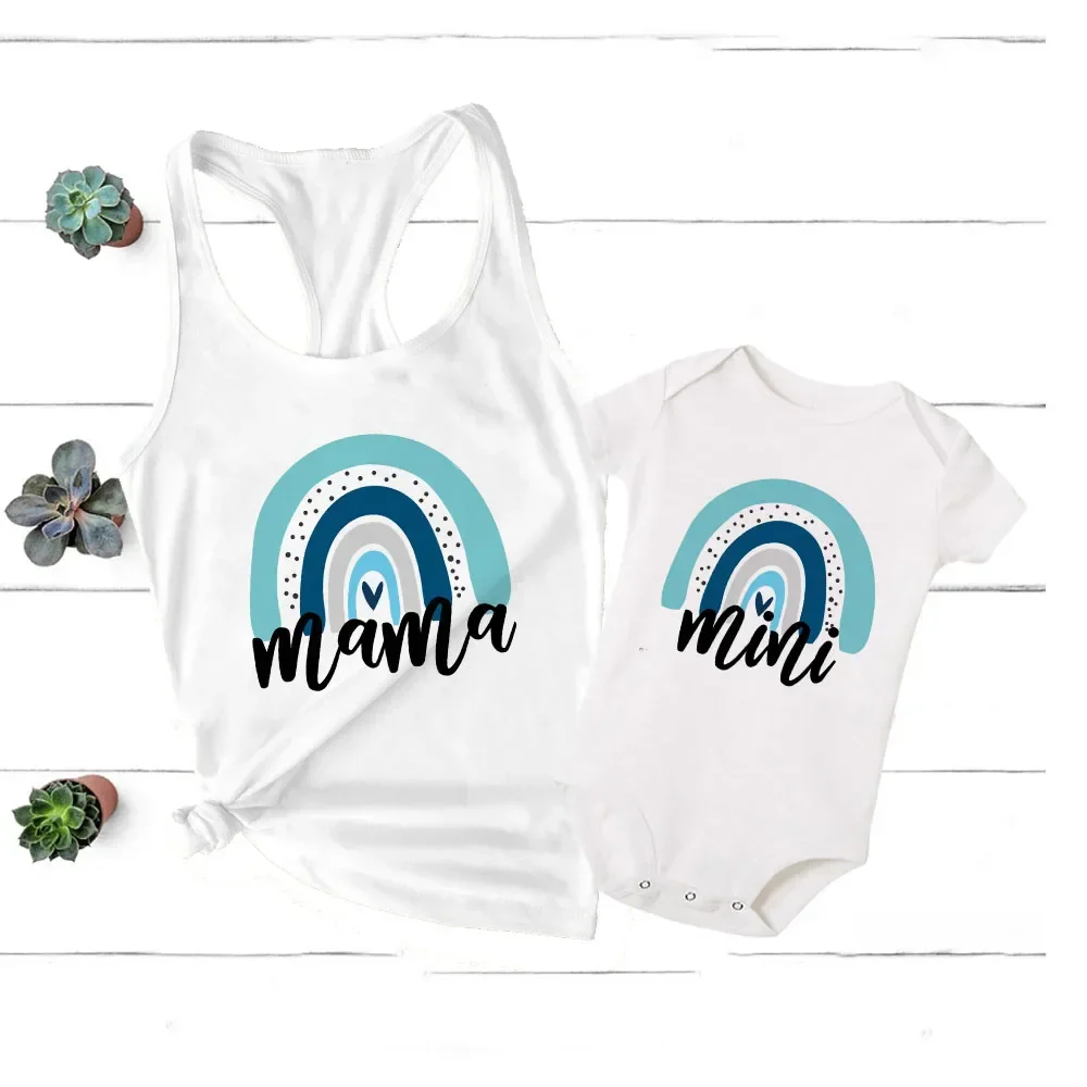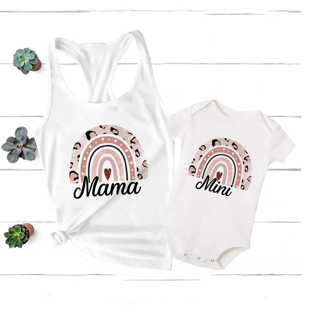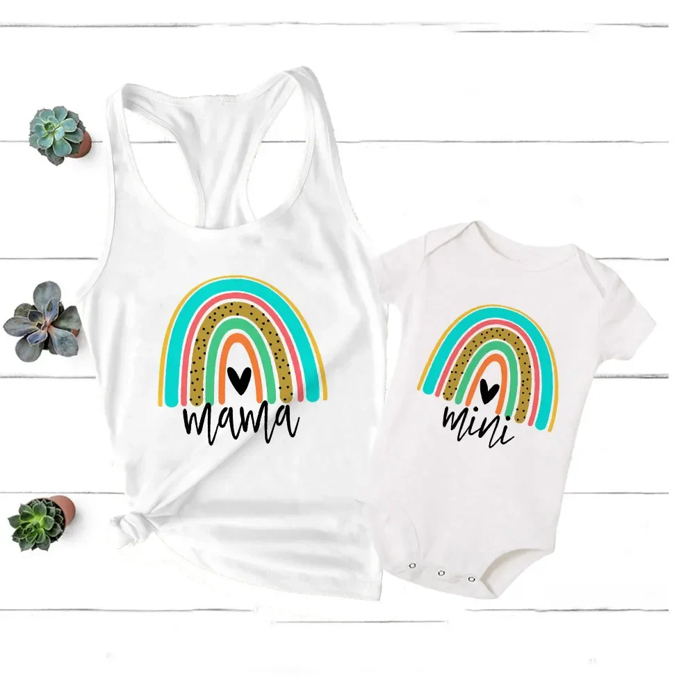 - Design charmant : Le t-shirt de la maman et la barboteuse de bébé arborent tous deux de ravissantes formes arc-en-ciel, ajoutant une touche de fantaisie à votre look.