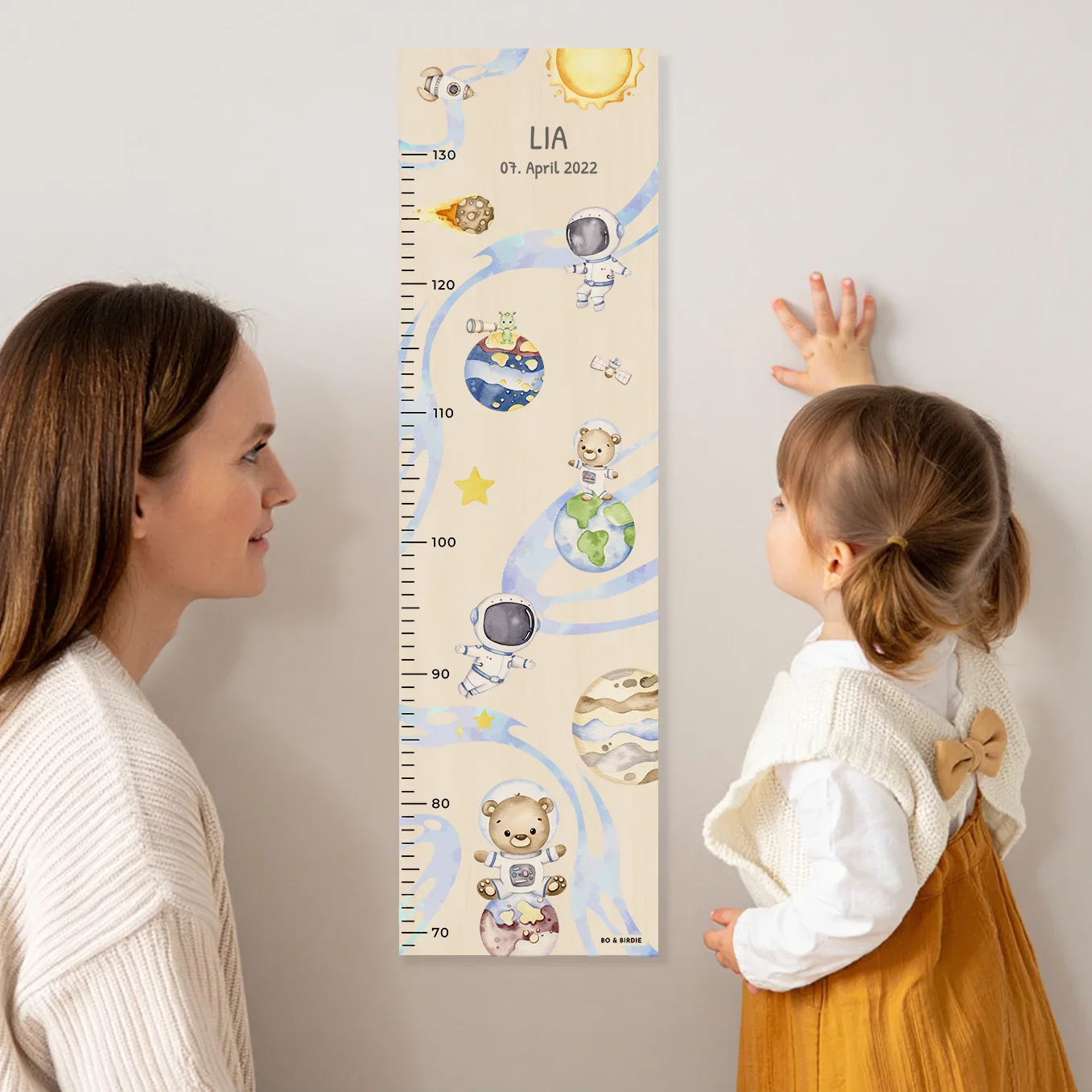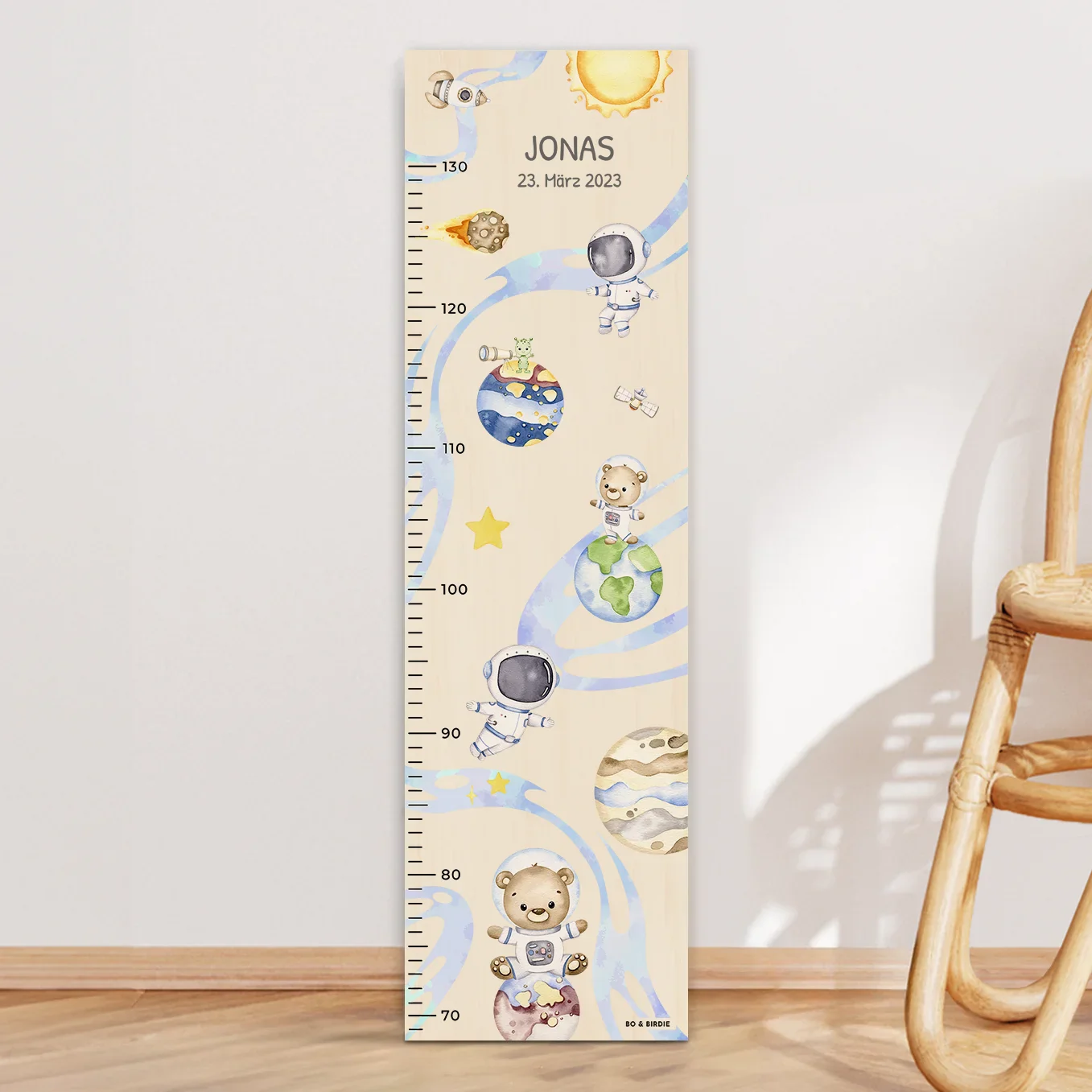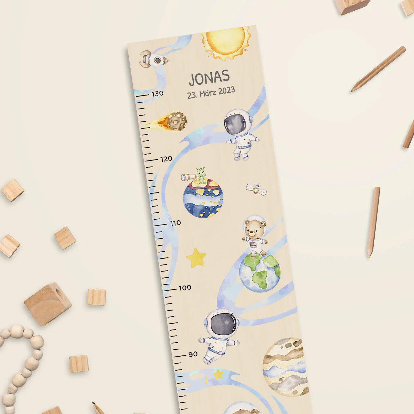 Toise de croissance personnalisée avec motifs spatiaux. Idéale pour une chambre d’enfant. Créez votre toise dès maintenant !