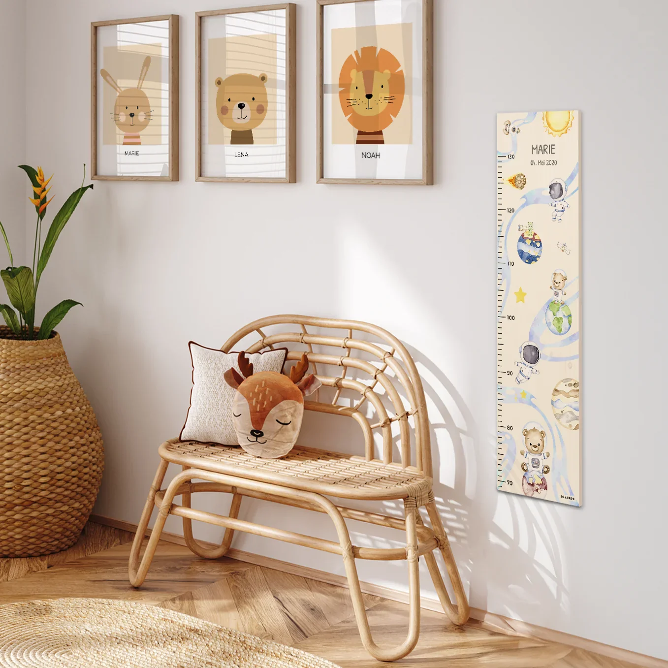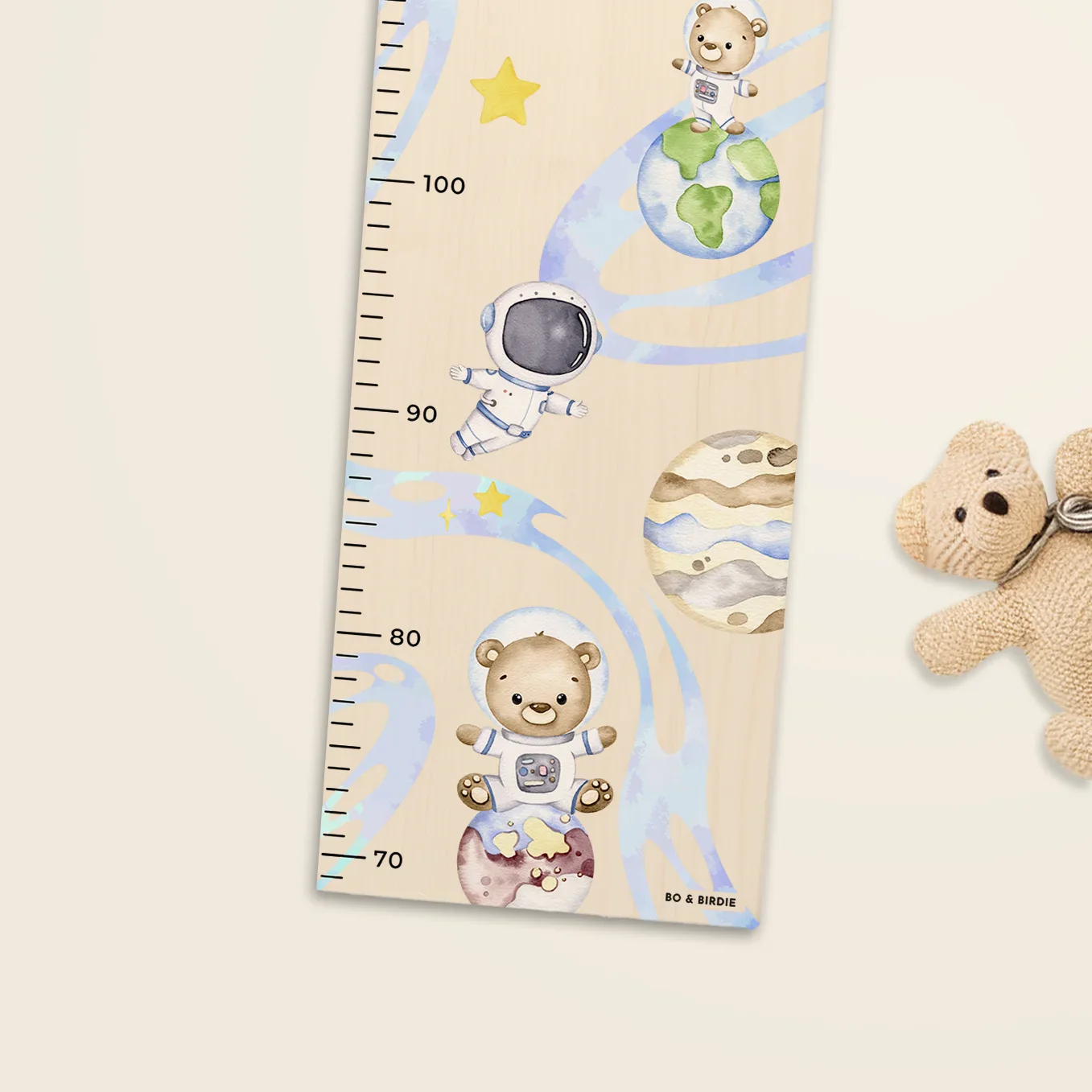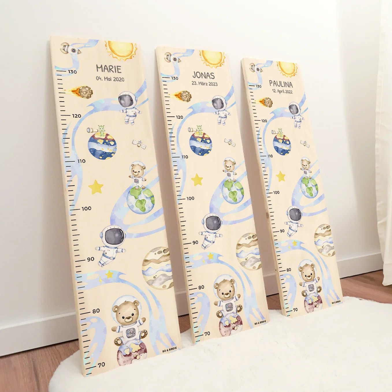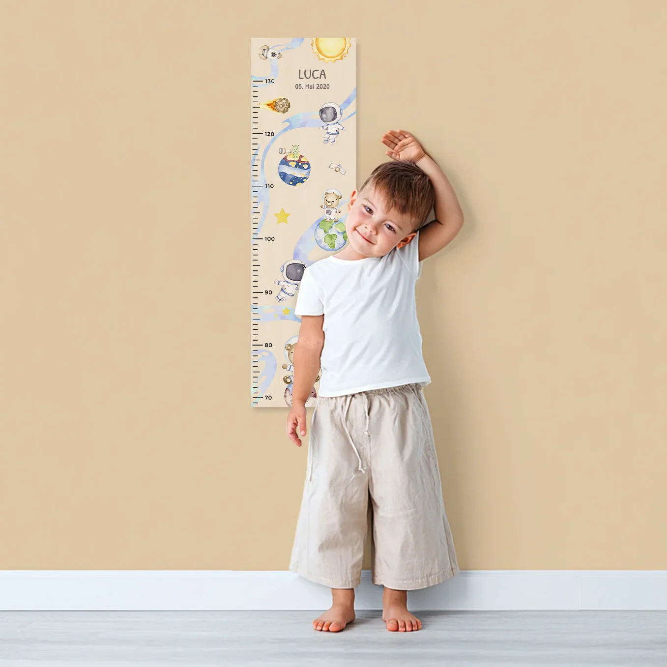 Toise de croissance personnalisée avec motifs spatiaux. Idéale pour une chambre d’enfant. Créez votre toise dès maintenant !