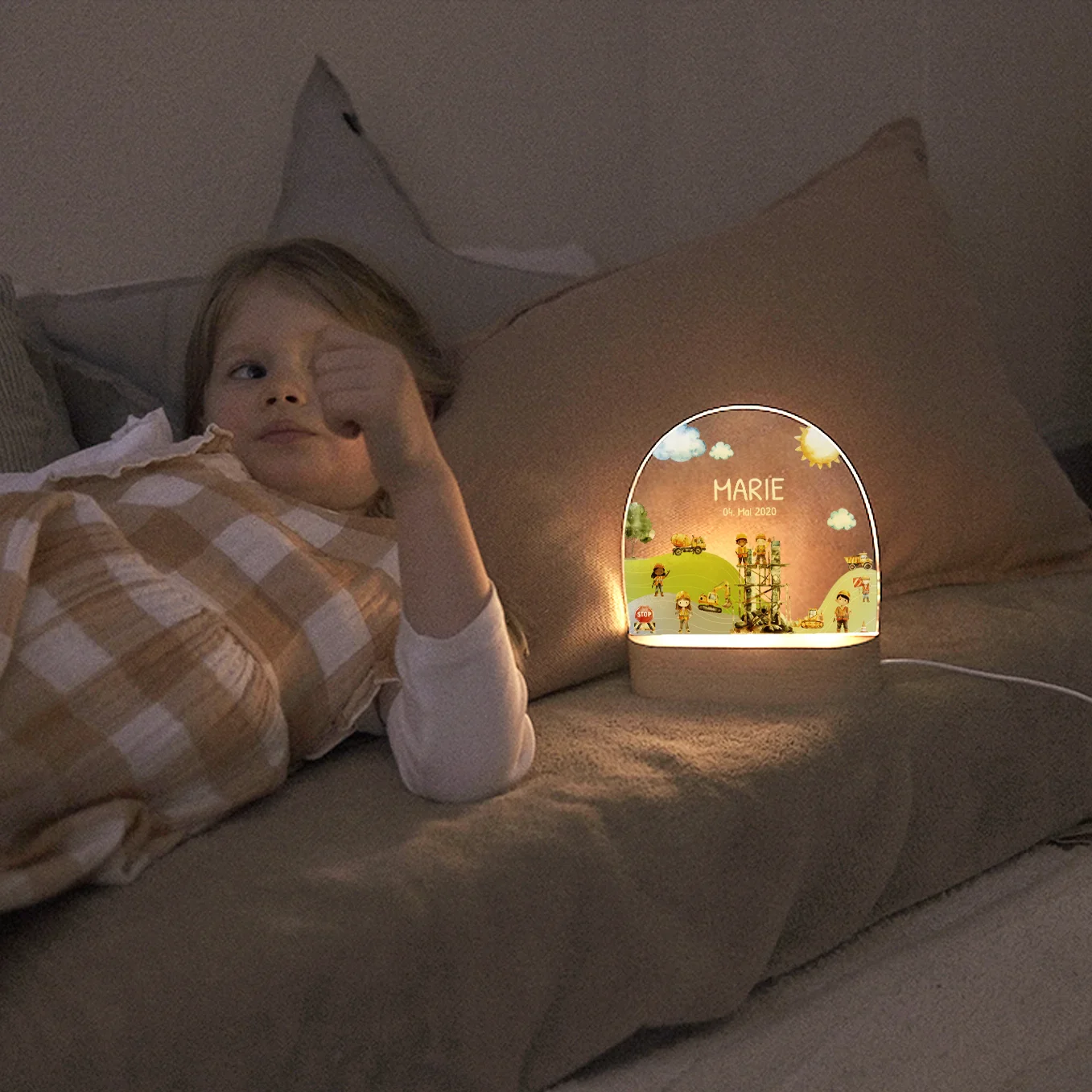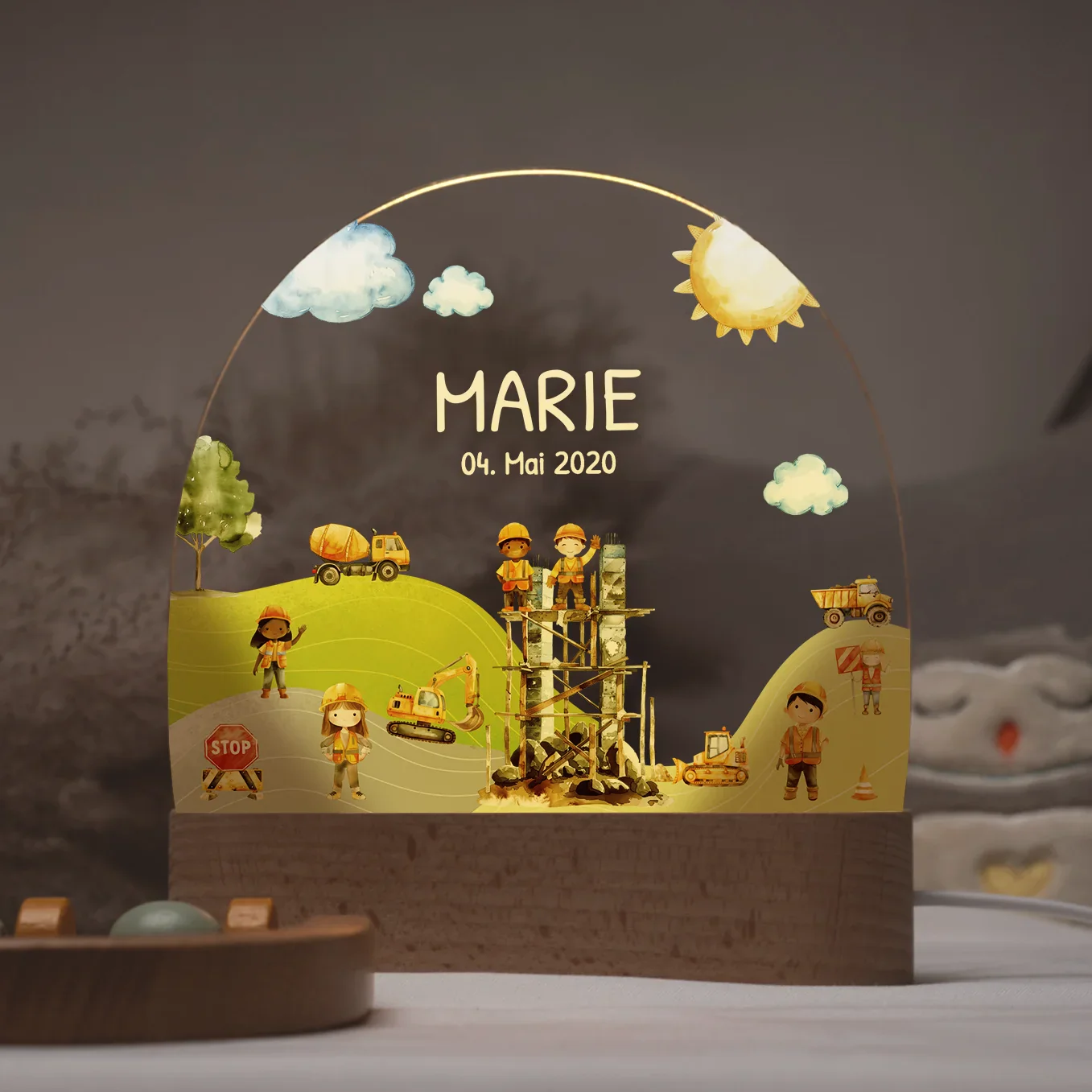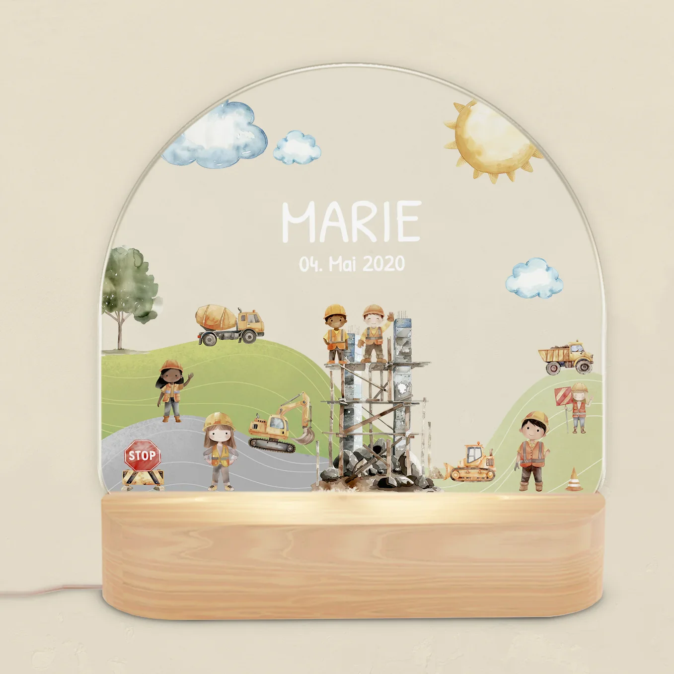 Veilleuse personnalisable avec motifs et prénoms de chantier. Parfait pour les petits artisans.