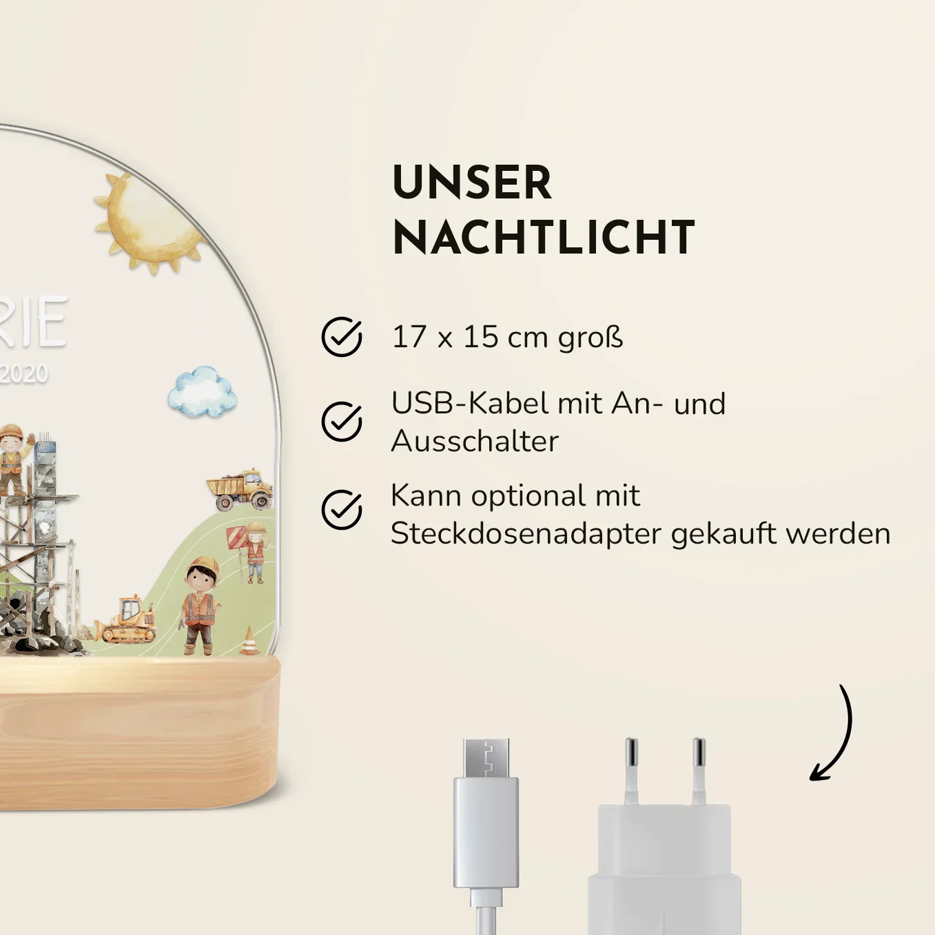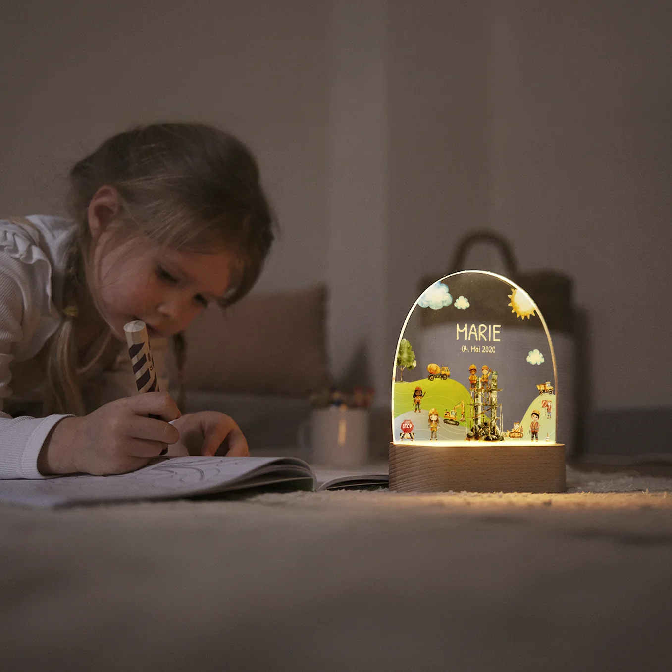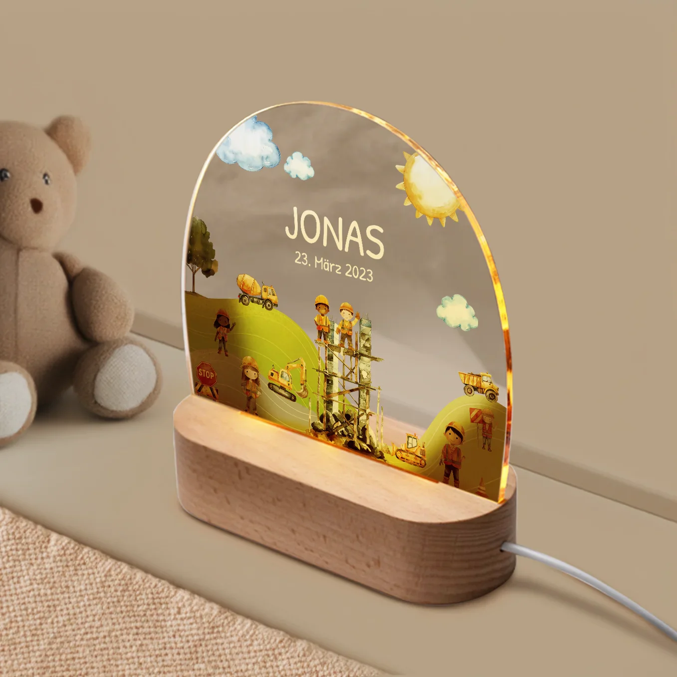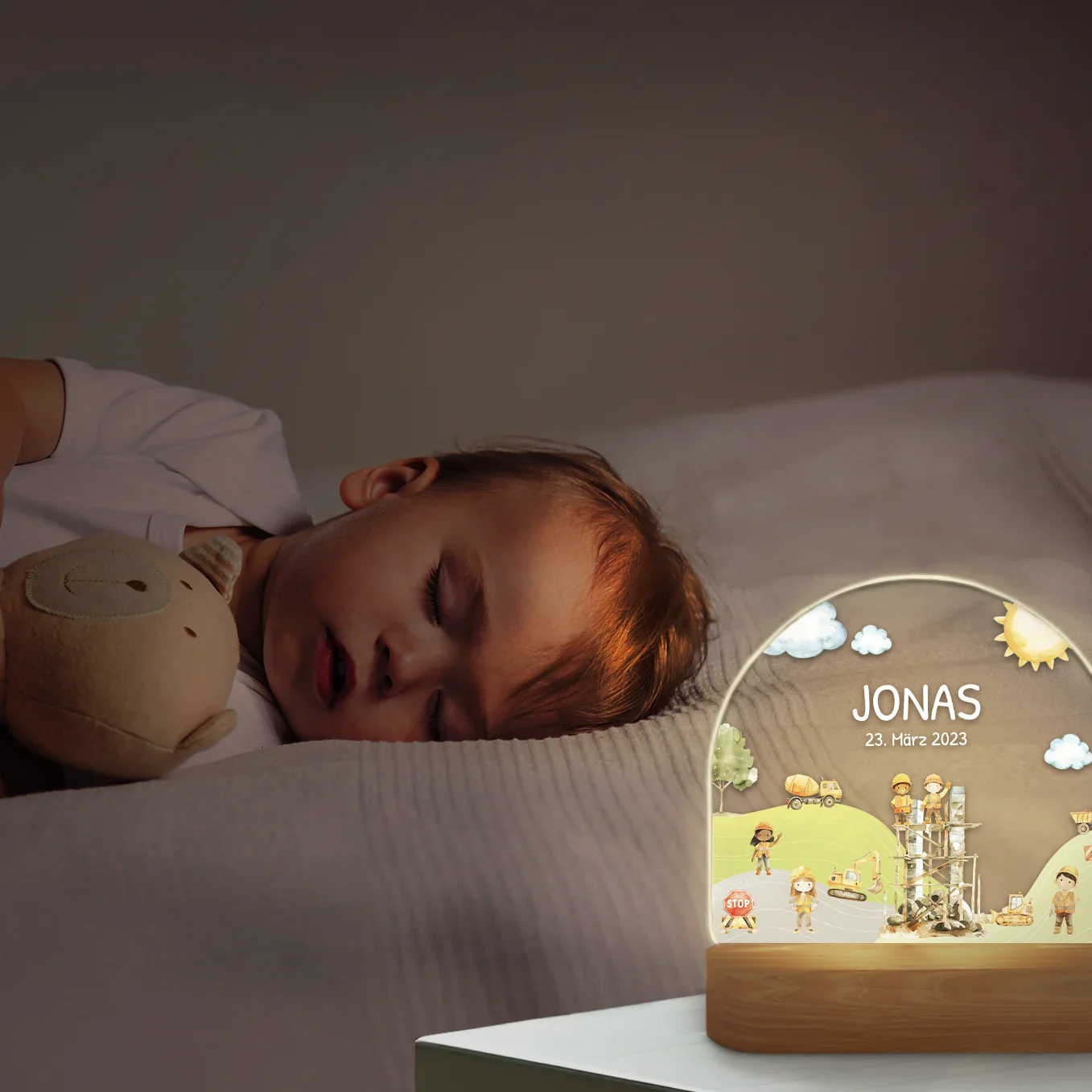 Veilleuse personnalisable avec motifs et prénoms de chantier. Parfait pour les petits artisans.