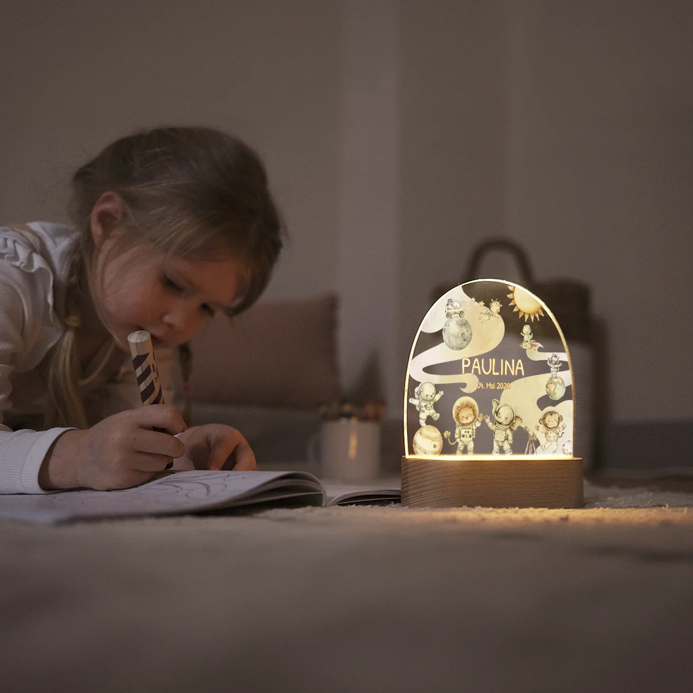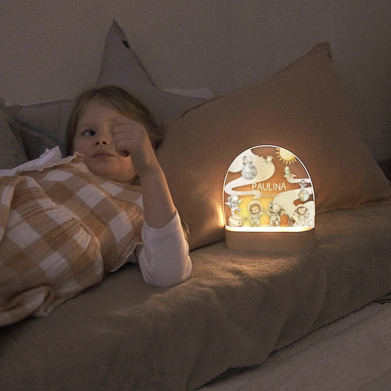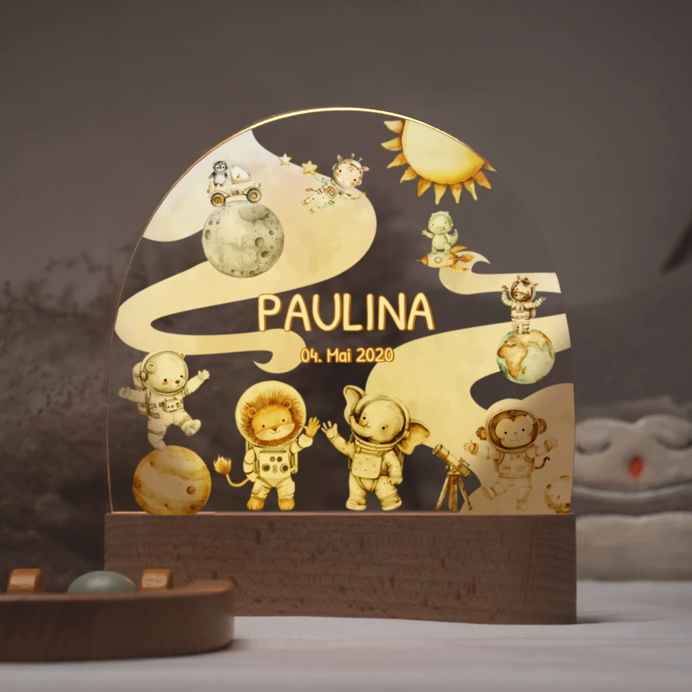 Veilleuse élégante de style scandinave. Personnalisé avec le nom et la date de naissance de l’enfant. Concevez dès maintenant votre propre veilleuse unique pour les enfants !