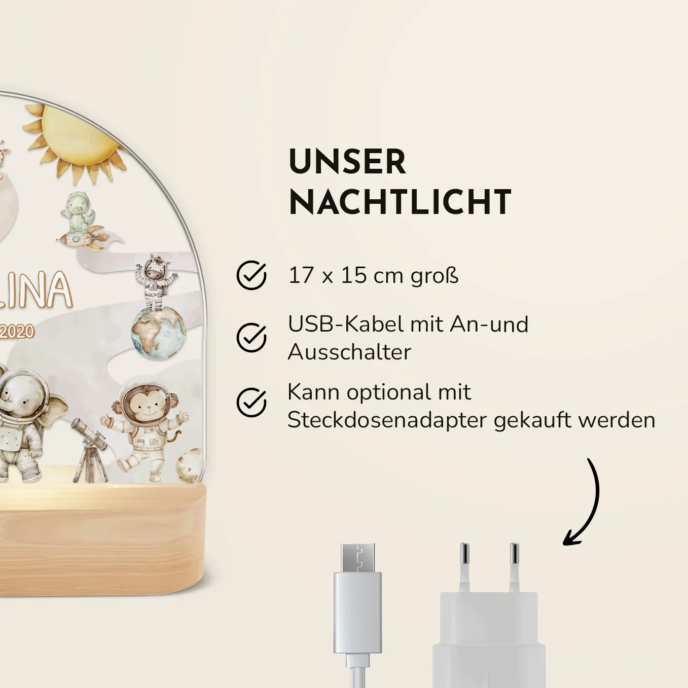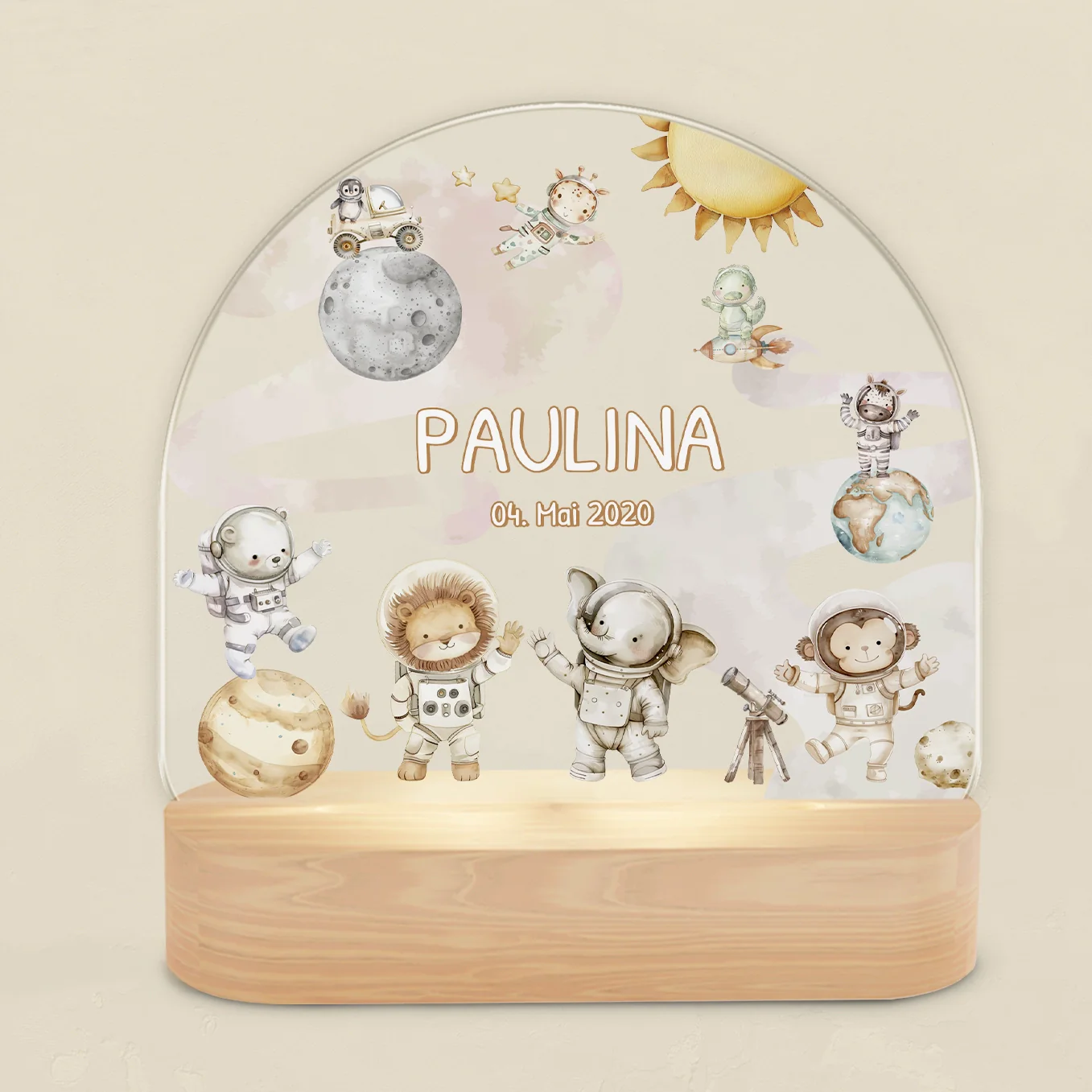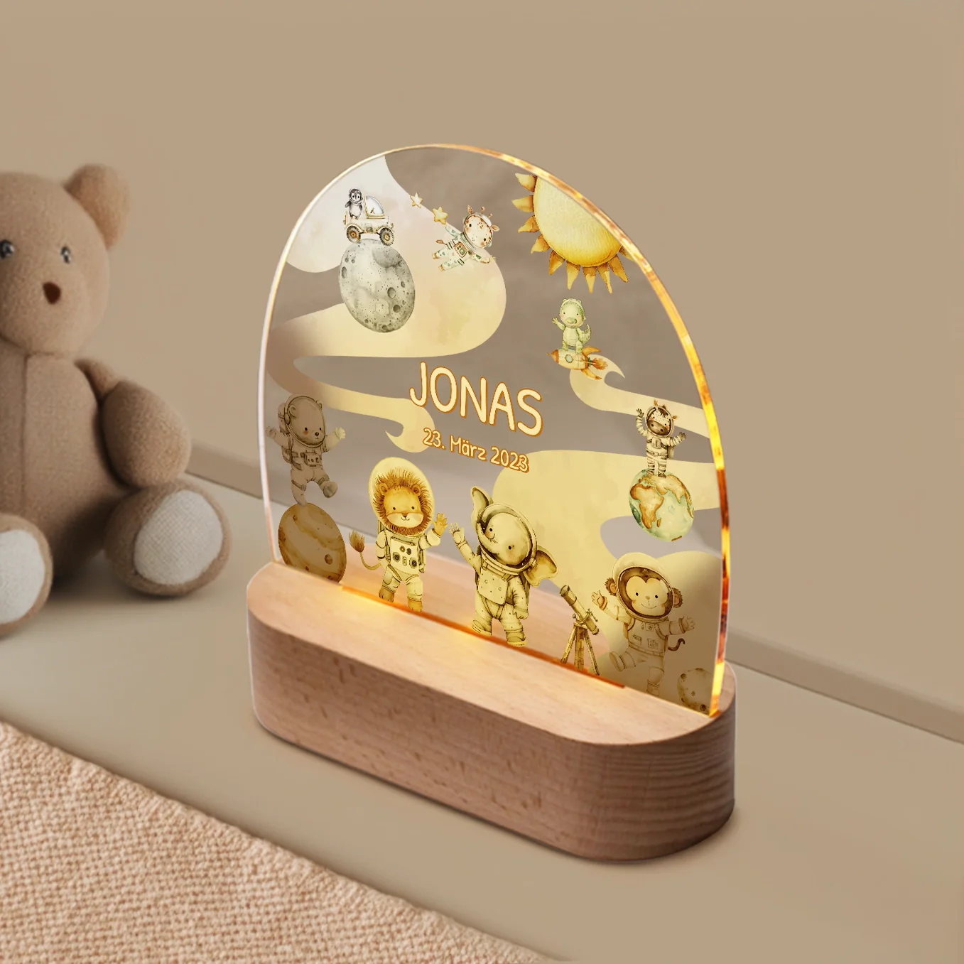 Veilleuse élégante de style scandinave. Personnalisé avec le nom et la date de naissance de l’enfant. Concevez dès maintenant votre propre veilleuse unique pour les enfants !